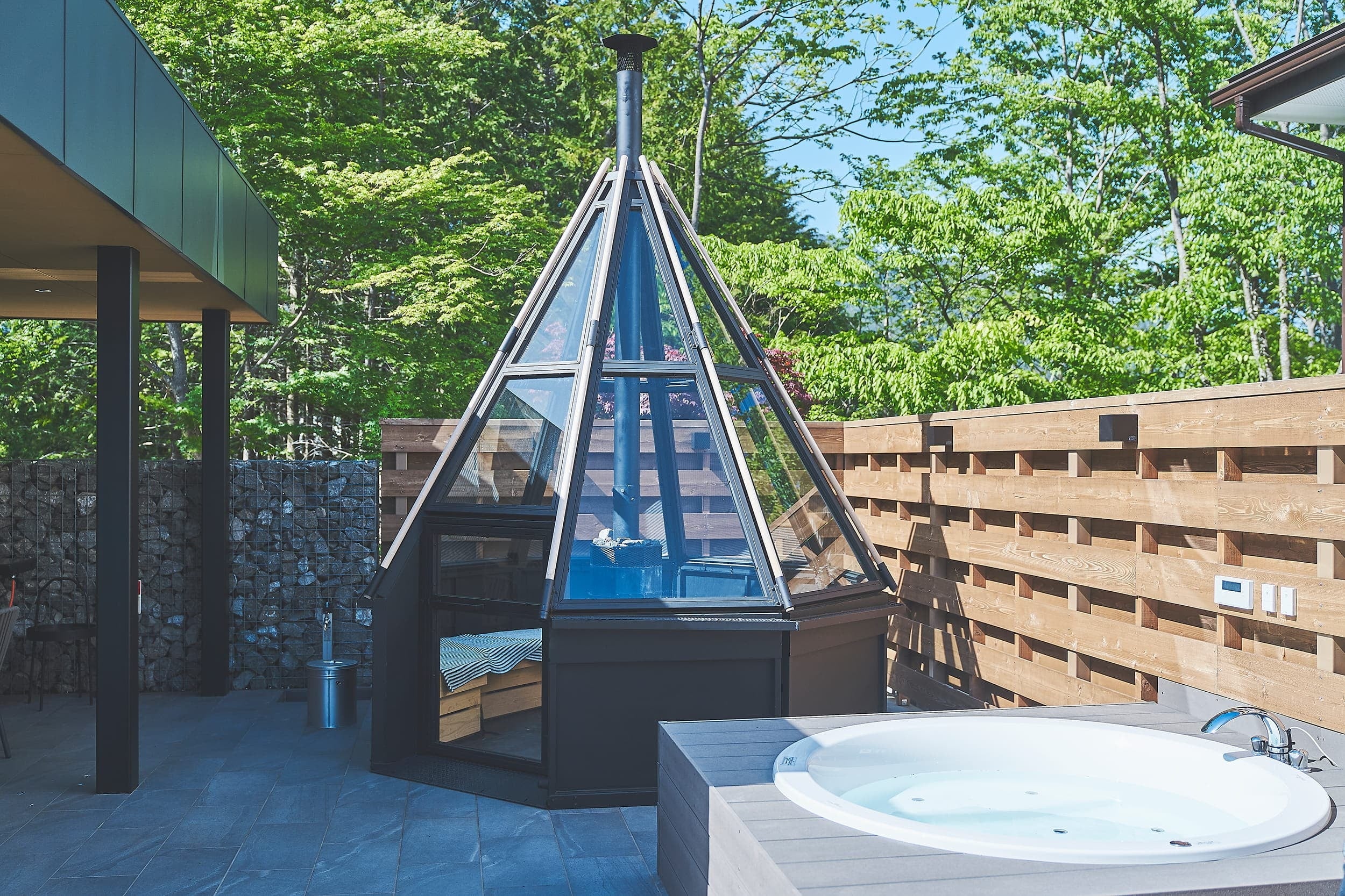 八角推で、全面ガラス張りの構造は、太陽光を利用した40度~60度の低温サウナから100度程の高温のサウナまで、お好みに合わせてお楽しみ頂けます。雨水を利用するエコ・ロウリュウも可能、サウナ後のプールは格別です。同じく新設したジャグジーとともに、富士山を目の前にしながらのセゾンだけの特別な温浴体験をお楽しみください。