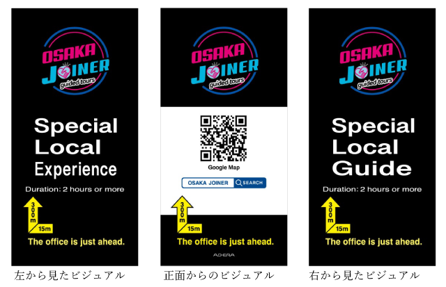 オーディエンスが移動しながらOOH を見ることでビジュアルが一瞬で大きく変化する不思議さや違和感で興味付けを誘発します。情報を見るだけのOOH ではなく体験しながら情報を得られるエンタメOOH として訪日旅行者に楽しんでいただくことや視認性・視覚効果の高い施策を実施することで訪日旅行者へサービスの認知獲得を図ることを目的としております。今回は正面では見えていたQR コードが横から見た時は消えて、「Osaka JOINER」のサービス内容をご案内するタグラインが出現する、軽い驚きを体験してもらいつつ、インバウンドオーディエンスに情報が到達するような仕掛けとなっております。