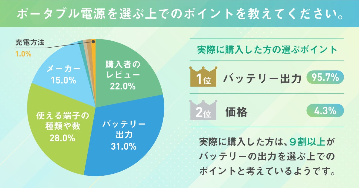 購入検討者のアンケート結果からは、スペックの他、実際に使った人の口コミを元に選びたいと考える人も一定数いる一方で、ポータブル電源を購入者の回答のみに絞ると、バッテリー出力が9割とポータブル電源のスペックを重視する人が圧倒的に多いようです。