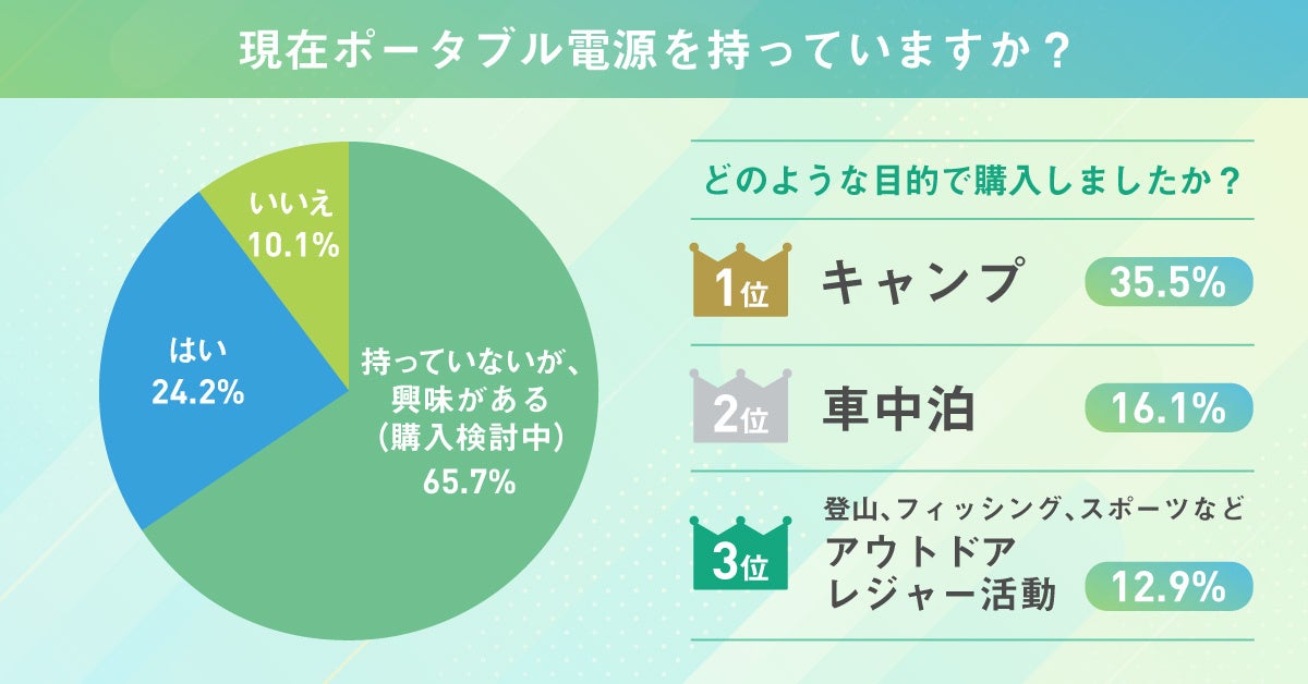 ポータブル電源についての意識調査を行ったところ、全体の約24%がポータブル電源を持っていると回答をし、購入予定だという方は約65%と、近年のポータブル電源の人気が伺えます。