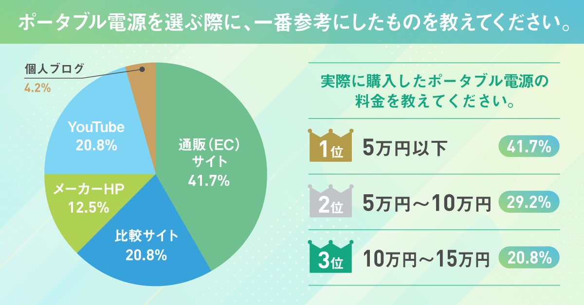実際にポータブル電源を購入した方の約4割が通販(EC)サイトを参考にしており、約7割の方が10万円以下のポータブル電源を購入していました。