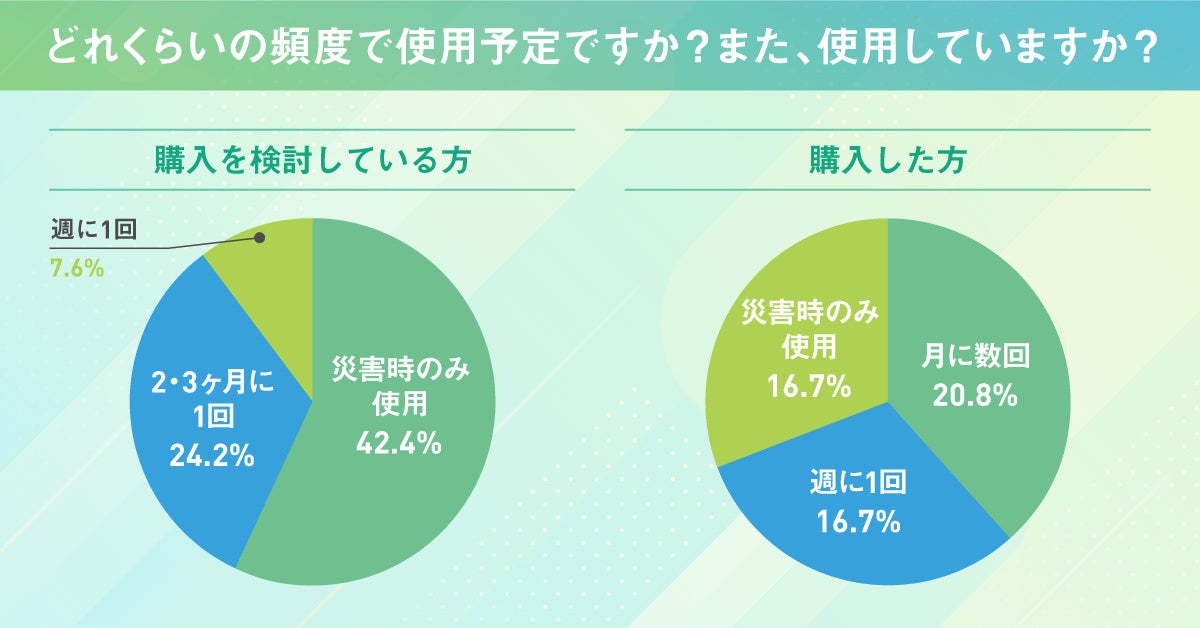 これからの季節、活躍が多くなりそうなポータブル電源ですが使用頻度は、購入予定の方は災害時のみの使用を想定している方が多い一方で、実際に持っている方は月に数回使用している方が多く、想定以上にポータブル電源を使用する場面が多いようです。