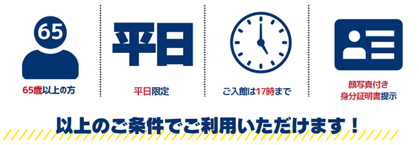 平日限定、17時までのご入館でご利用いただけます。ご利用時はフロントにて専用カードと身分証明書をご提示ください。