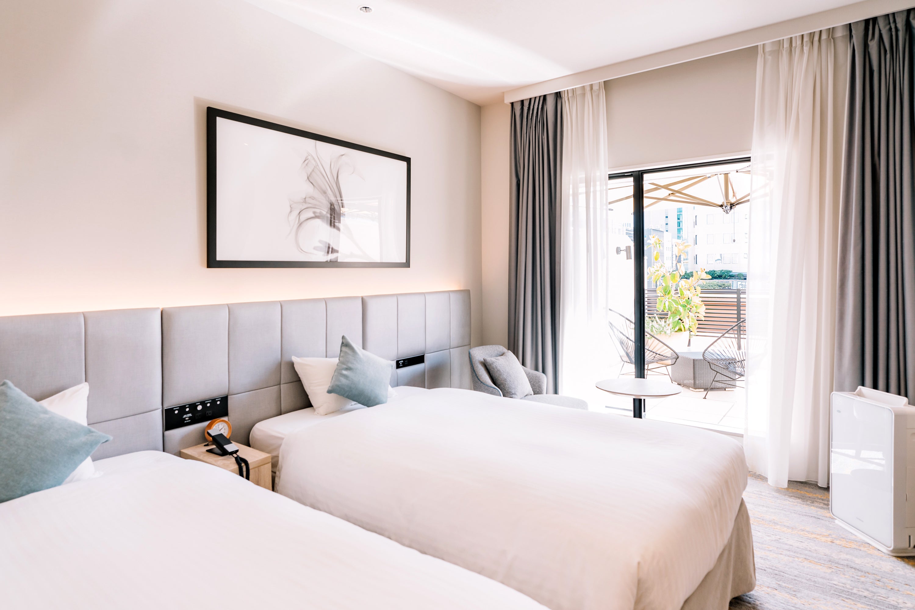 ナチュラルで落ち着いた雰囲気のツインルームに併設された、14.5m²のバルコニーにお子様用ミニプールを設置。プライベート空間で、思い切り水遊びをお楽しみいただけます。さらにホテル契約駐車場24時間サービス券の特典も付いているので、お車を使った夏休みの家族旅行にも最適です。夏休みの思い出作りにぜひ本プランをご利用ください。