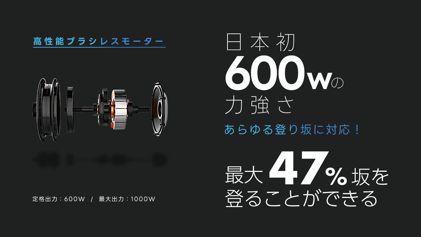 1,業界初、日本初の600W高性能特定小型原付、登坂能力最大斜度47%、走行距離50km超