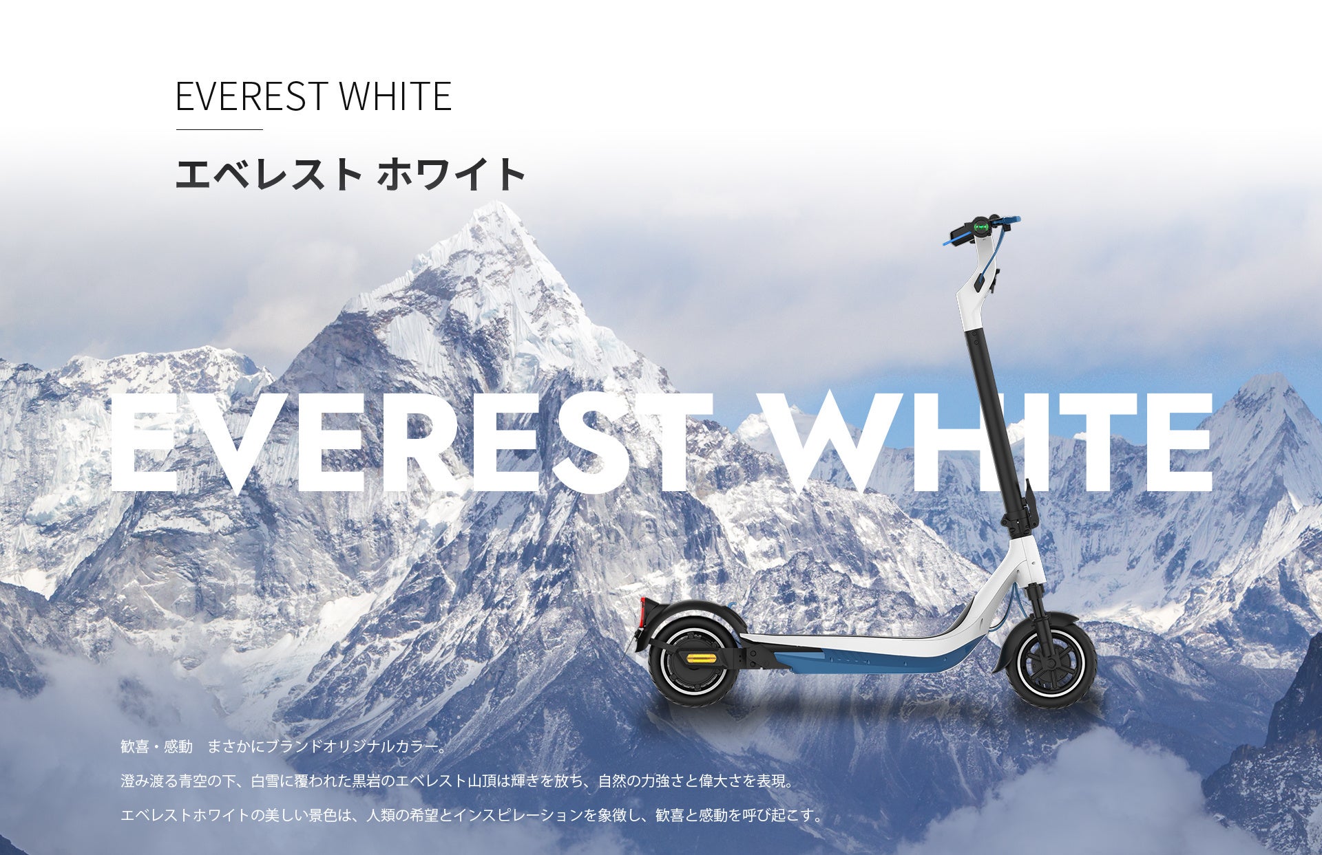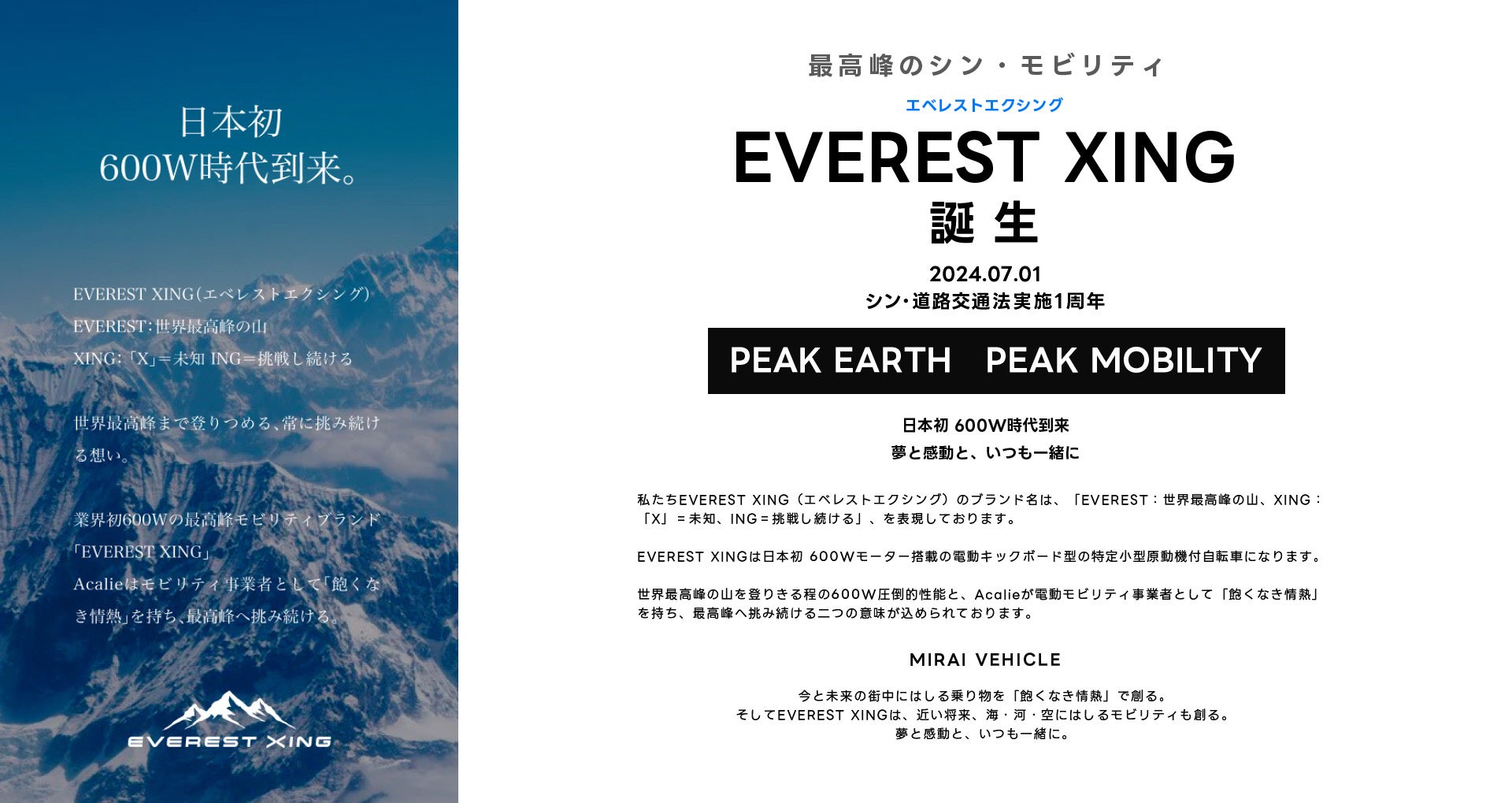 世界最高峰の山を登りきる程の600W圧倒的性能と、Acalieが電動モビリティ事業者として「飽くなき情熱」を持ち、最高峰へ挑み続ける二つの意味が込められております。