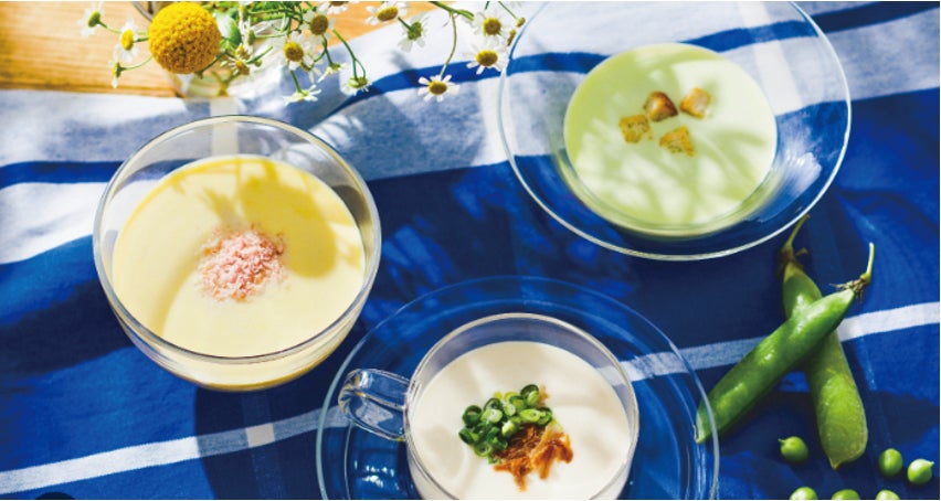 北海道産のスイートコーンと国産のさつま芋のおいしさを、十二分に発揮させました。素材独自の甘さが魅力の冷たいスープです。