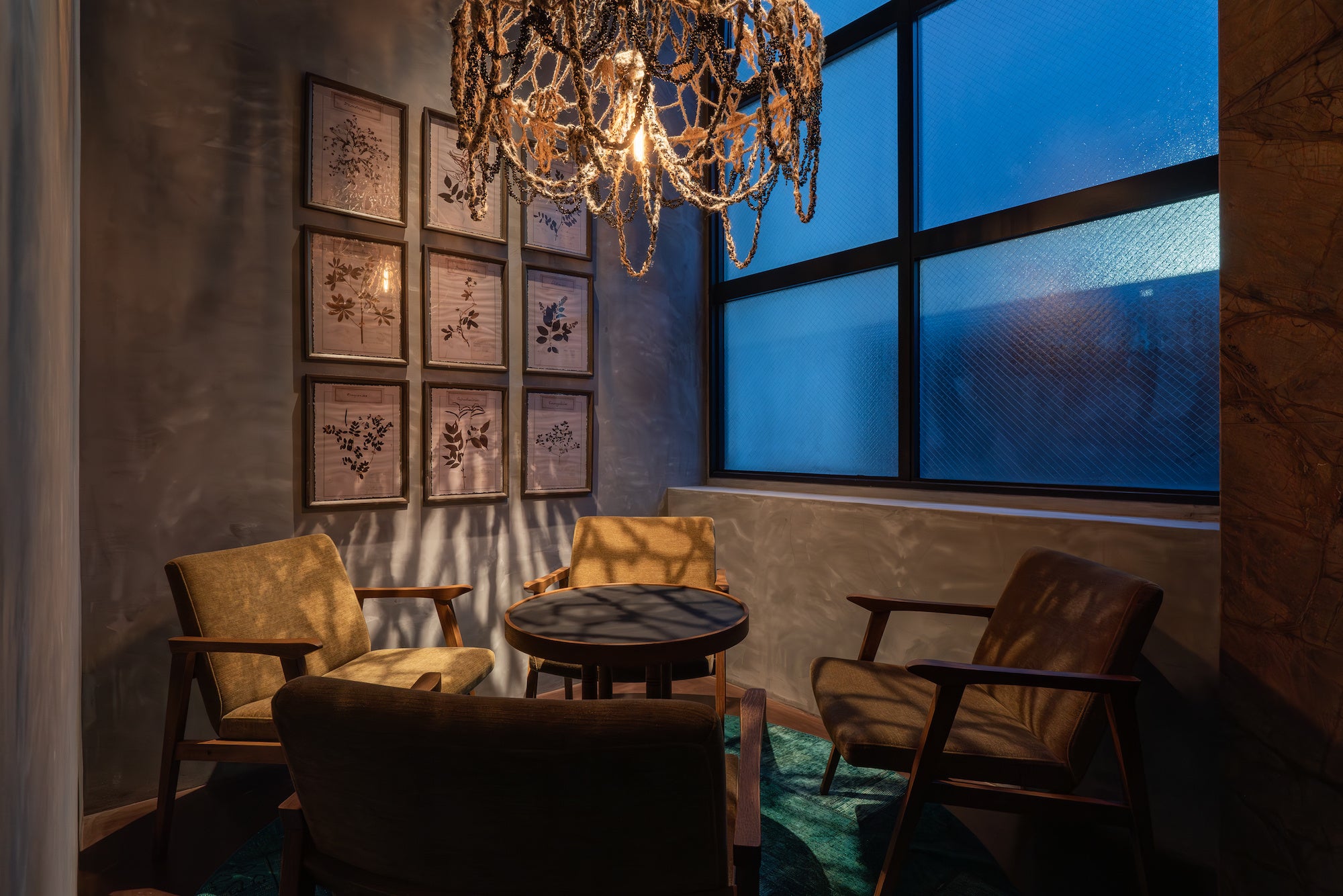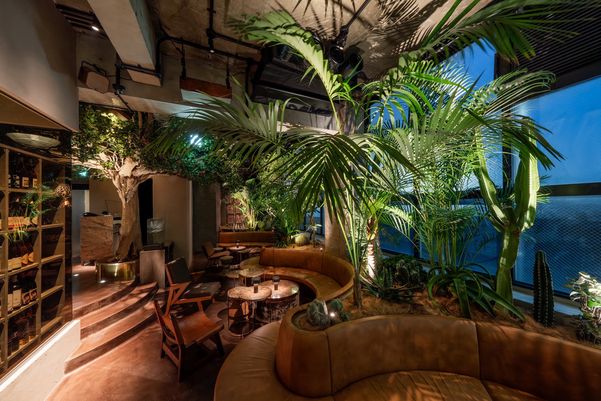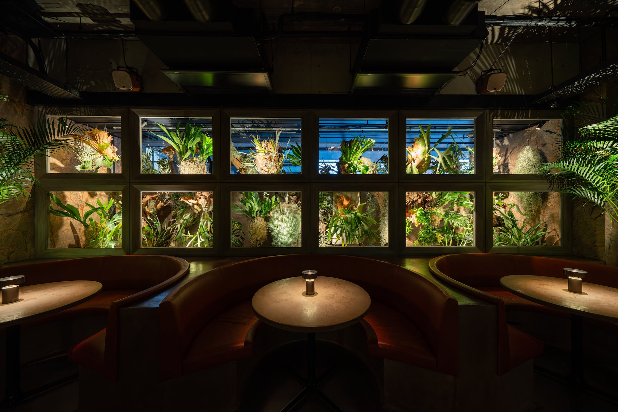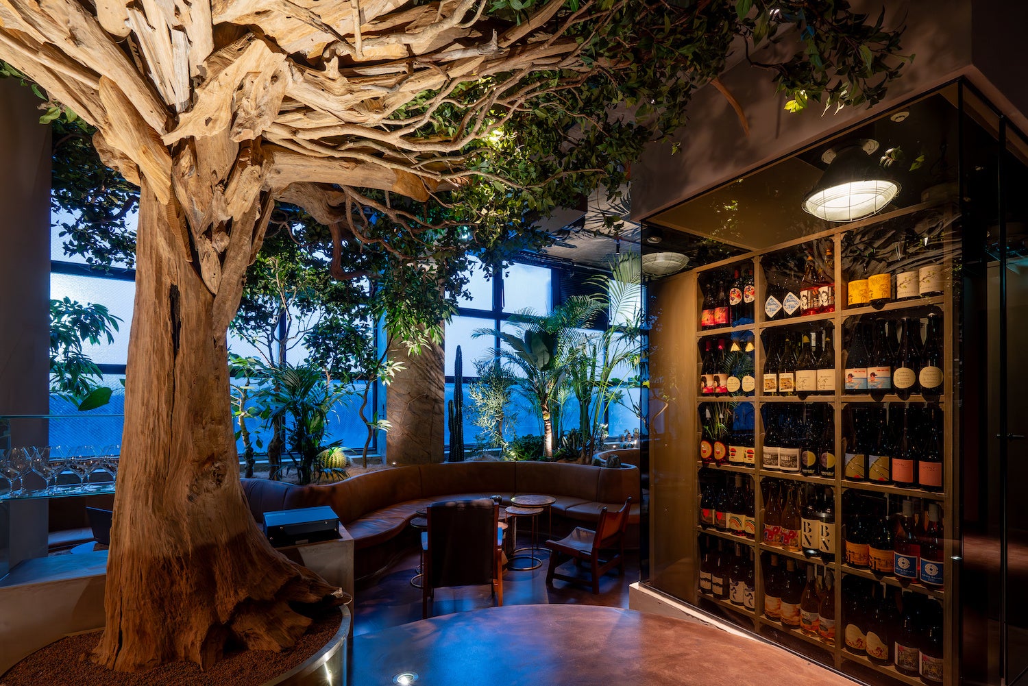 店内には、独特の存在感を放つ多肉植物や希少価値の高いユーフォルビア、熱帯植物ビカクシダや南米や中米に生息するチランジアなど、世界各地で買い付けてきた珍しい植物が生い茂り、中央には古材で造られた巨大なシンボルツリーが存在感を放ちながら、ゲストを見守るように佇みます。ヴィンテージ家具が独自の世界観を演出する空間には、フロア一面に広がる曲線が印象的なソファのラウンジ(半個室席もあり)、スタンディングでも楽しめるハイチェアのカウンターバー、ゆっくりと食事も楽しめるテーブル席のダイニングの3つの異なるエリアで構成されています。
