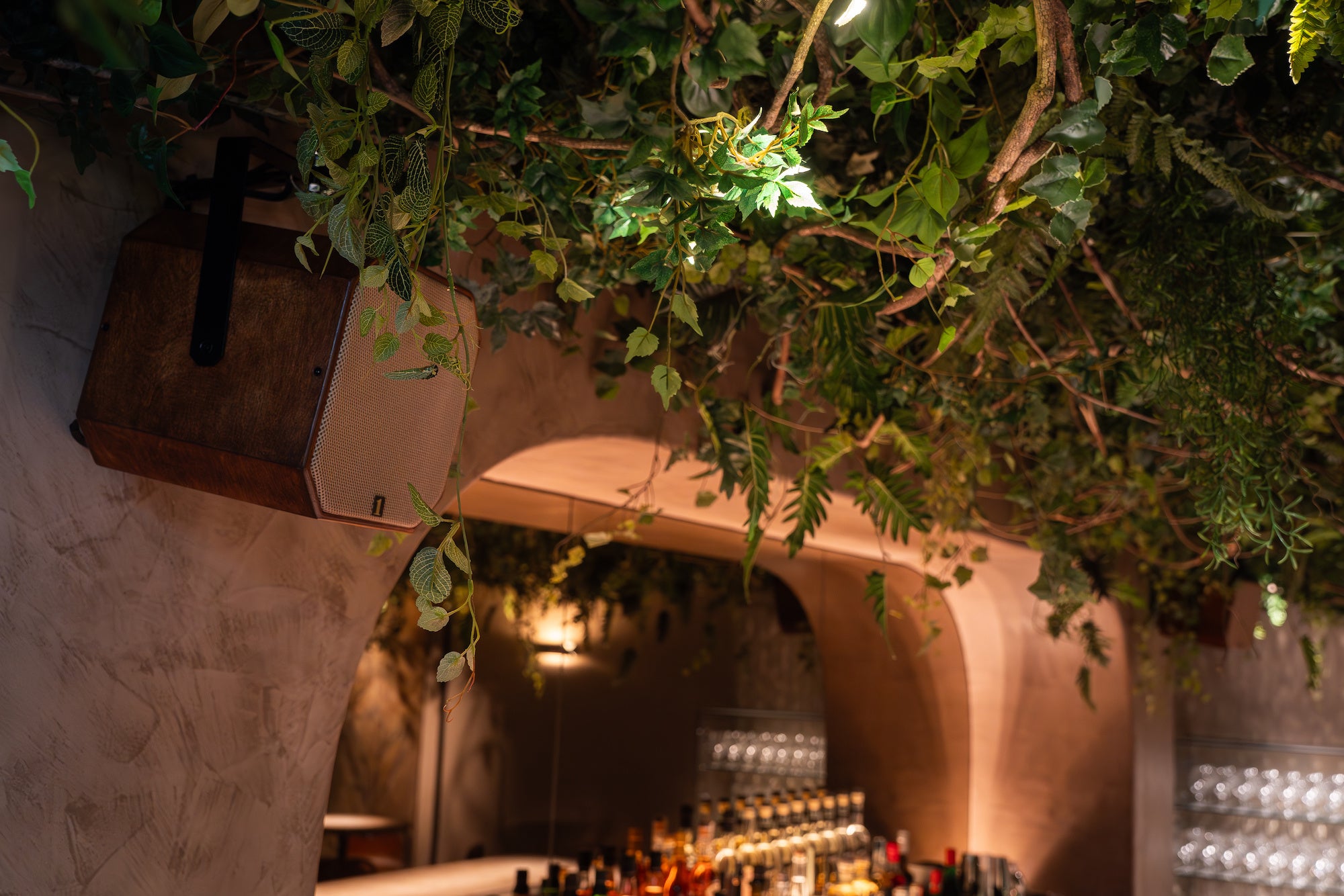 一般的なミュージックバーとは一線を画す圧巻の音楽体験を味わえる店内には、現在、最新鋭~最高峰と名高い米国1 SOUND社製のスピーカー10基をあえて天井に配置。店内どこにいても、音楽が森の木々から降り注ぐように全身を包み込みます。解像度は高く、鮮明に音像を全身に響き渡らせる音圧を保ちながらも、決して会話の邪魔をしない絶妙な音響設計が施されています。