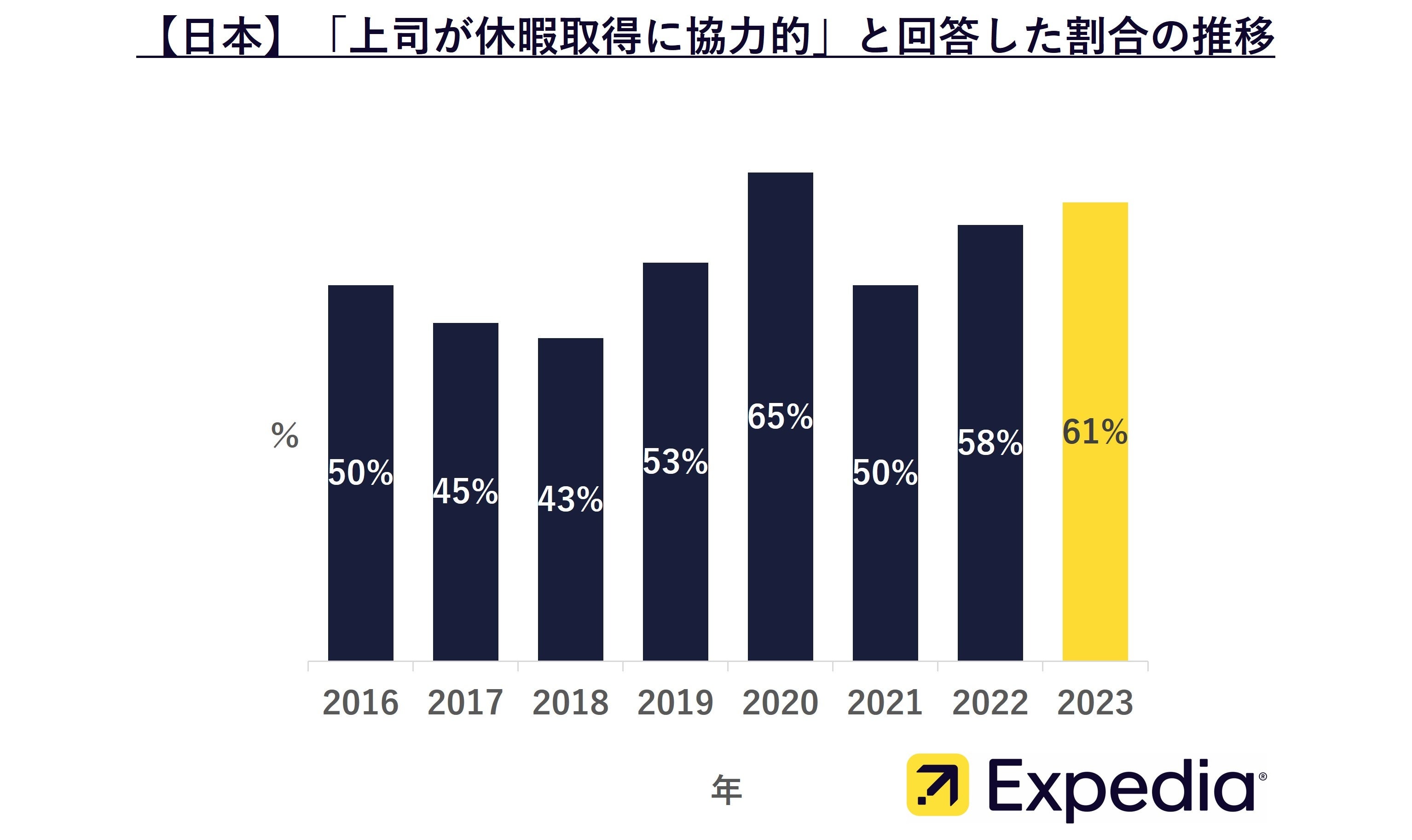 一方で、自身の上司が休暇取得に協力的かについて、61%が「協力的である」と回答。過去の調査の同回答の推移を見てみると、この割合は2020年の65%には及ばないものの、2022年からは3%上昇しました。2019年4月に有給休暇の取得が義務化され、上司や職場の協力体制も徐々に改善されているようです。