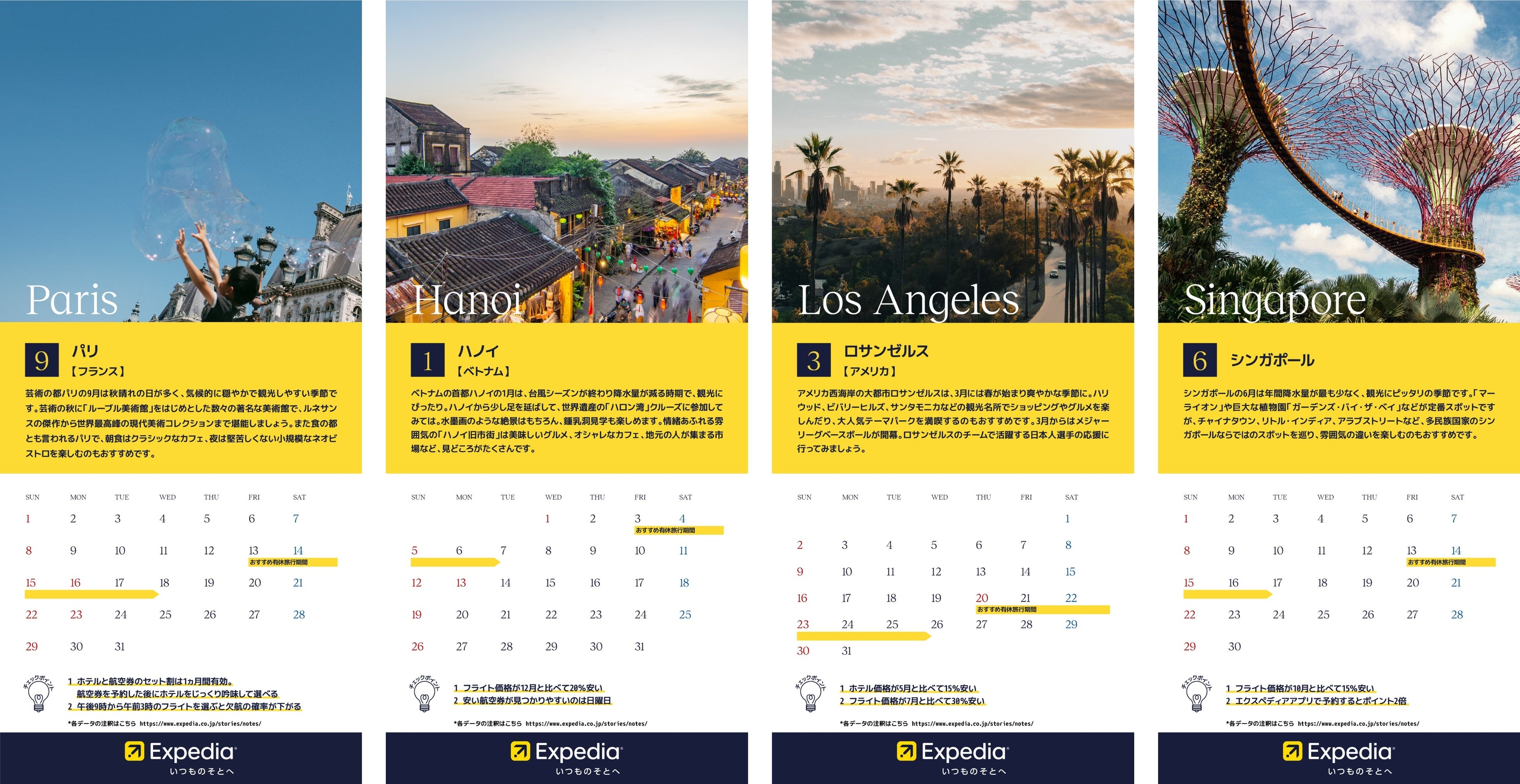 そこで、エクスペディアは日本で働く人に、積極的に有給休暇を取得して海外旅行をしてもらうべく「有休旅行カレンダー(Travel Calendar)」を提供します。各月のページにはその月にベストシーズンを迎えるおすすめ海外旅行先を紹介し、そこへ旅行するにあたりどの日程で有給休暇を取得して、何泊の旅行にすべきかなどをご提案しています。