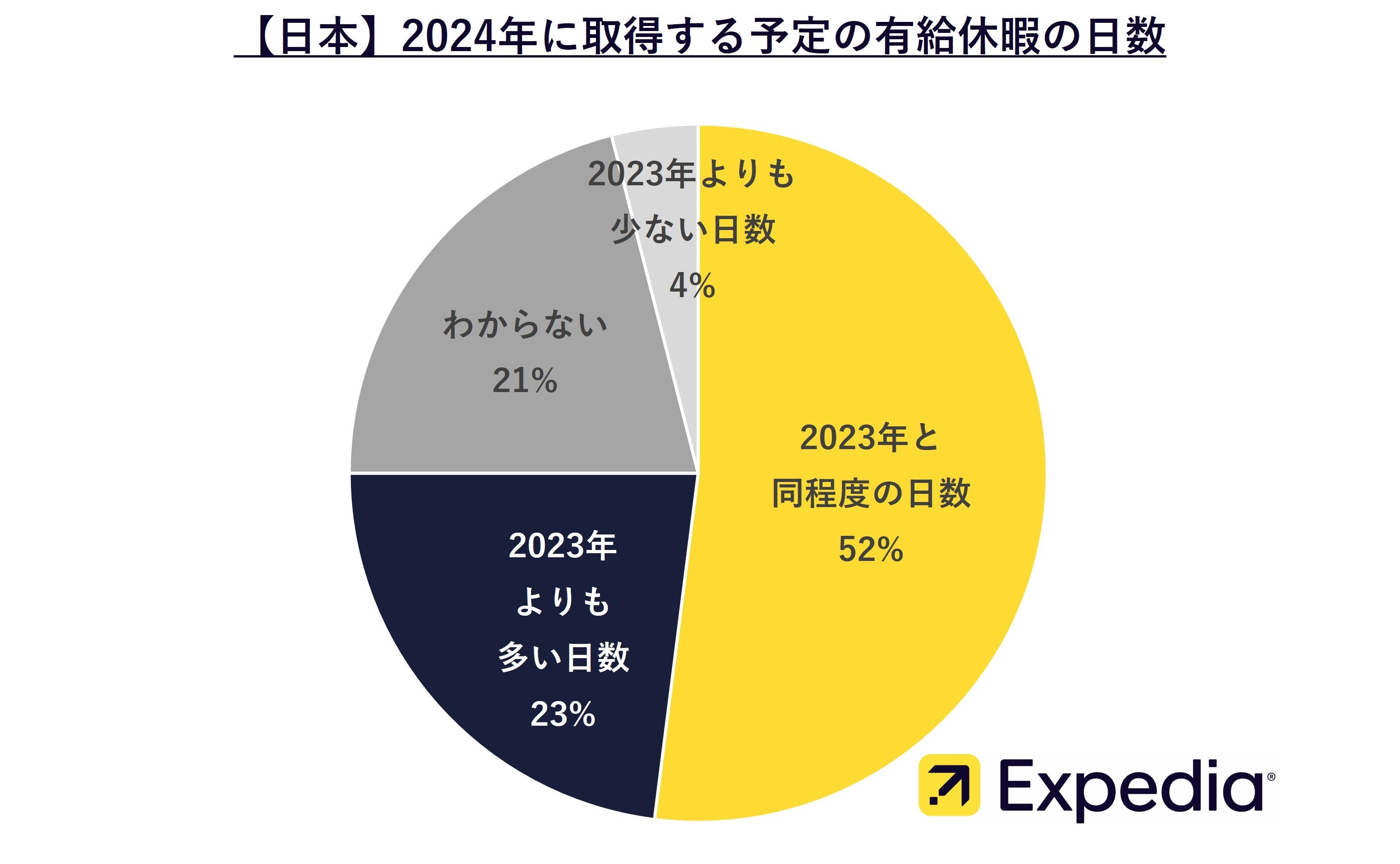 休暇の取得について、日本で働く人の53%が「仕事をカバーしてくれる同僚に罪悪感がある」と回答、世界で3番目に多い割合となりました。さらに、2024年に取得する予定の有給休暇の日数について、日本で働く人の52%が「2023年と同じ程度の日数」と回答、21%が「わからない」と回答しました。「罪悪感」の影響もあるからか、休暇取得にあまり積極的でないことが伺えます。