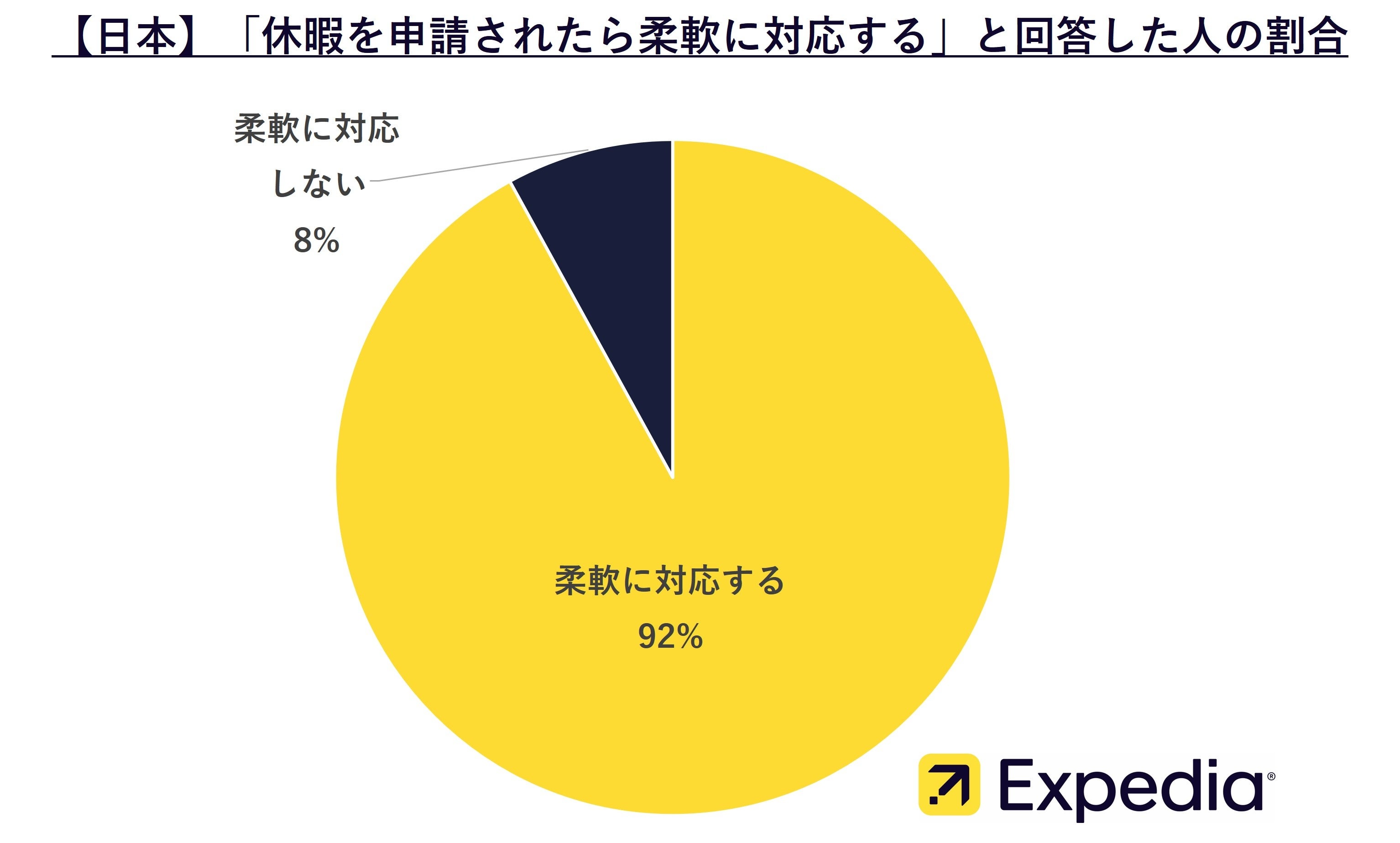 日本で働く人のうち、部下の休暇取得を承認する立場にある人(n=421)の92%が「休暇を申請されたら柔軟に対応する」と回答し、休暇取得に対し、9割以上の上司が実際に協力的であることがわかりました。
