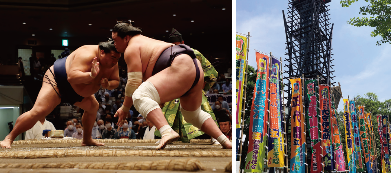 両国といえば、ご存知日本伝統の国技・大相撲の聖地。両国国技館では年に3度、本場所が開催されます。白熱の大相撲を現地で観戦し、緑豊かな和風庭園「旧安田庭園」や八角部屋・錦戸部屋(外観のみ)、相撲の神様を祀る野見宿禰神社をめぐる両国散策が楽しめます。
