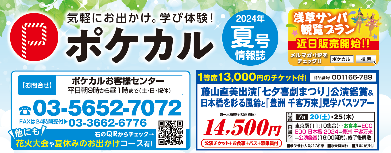 「ポケカル」はポケットに入る程度のちょっぴり知的なカルチャーエンターテインメントを味わう日帰り旅行専門サイトです。『日帰りレジャー』に特化することで、バスツアー、クルーズツアー、街歩き、体験イベント、体験教室、工場見学など、他社にはないツアー・商品のオリジナリティを追及した常時 200 以上の豊富なコンテンツを提供しています。どの世代・どの国の方にも記憶に残るものになるようにとの想いを込めて企画されています。