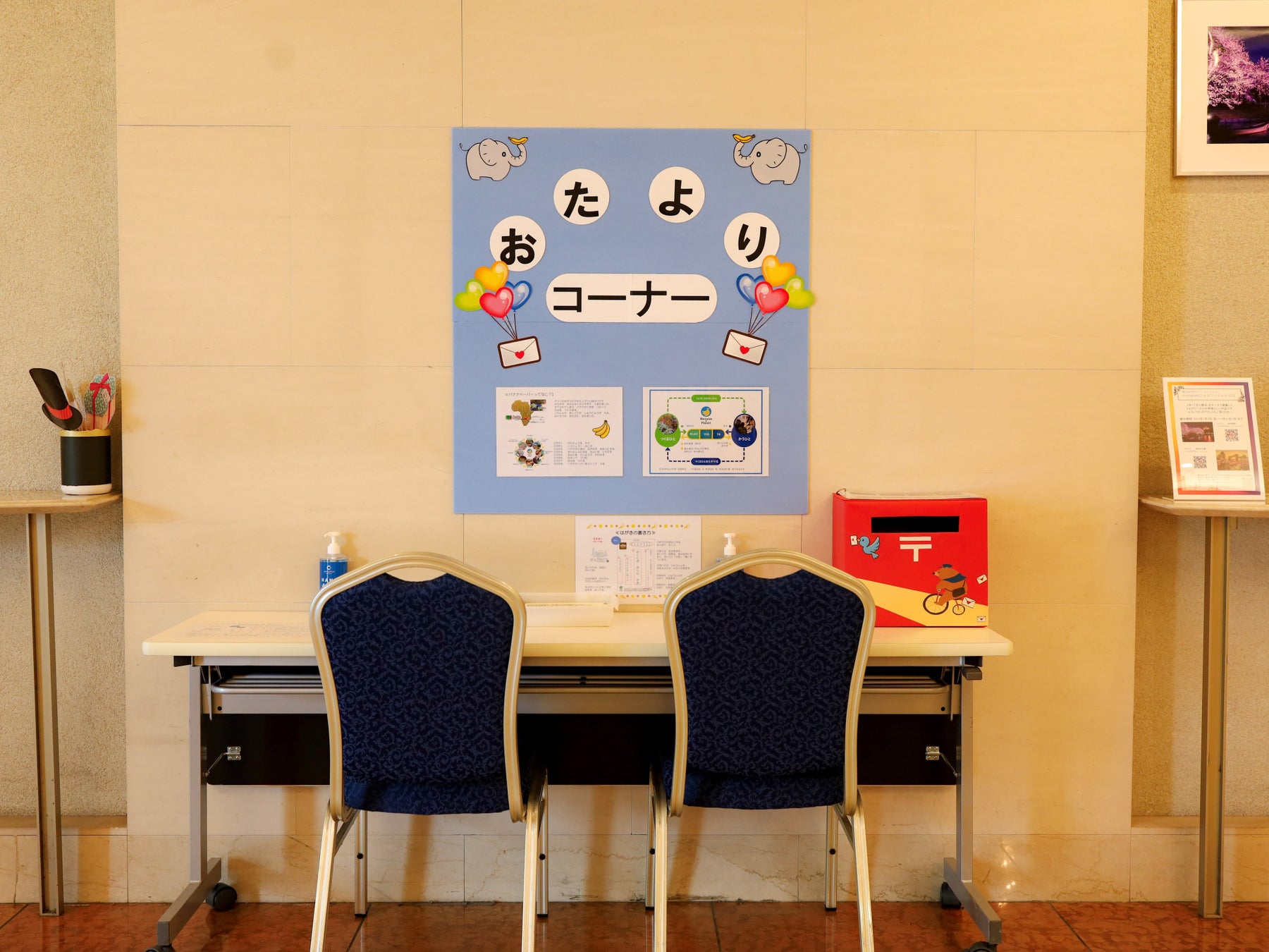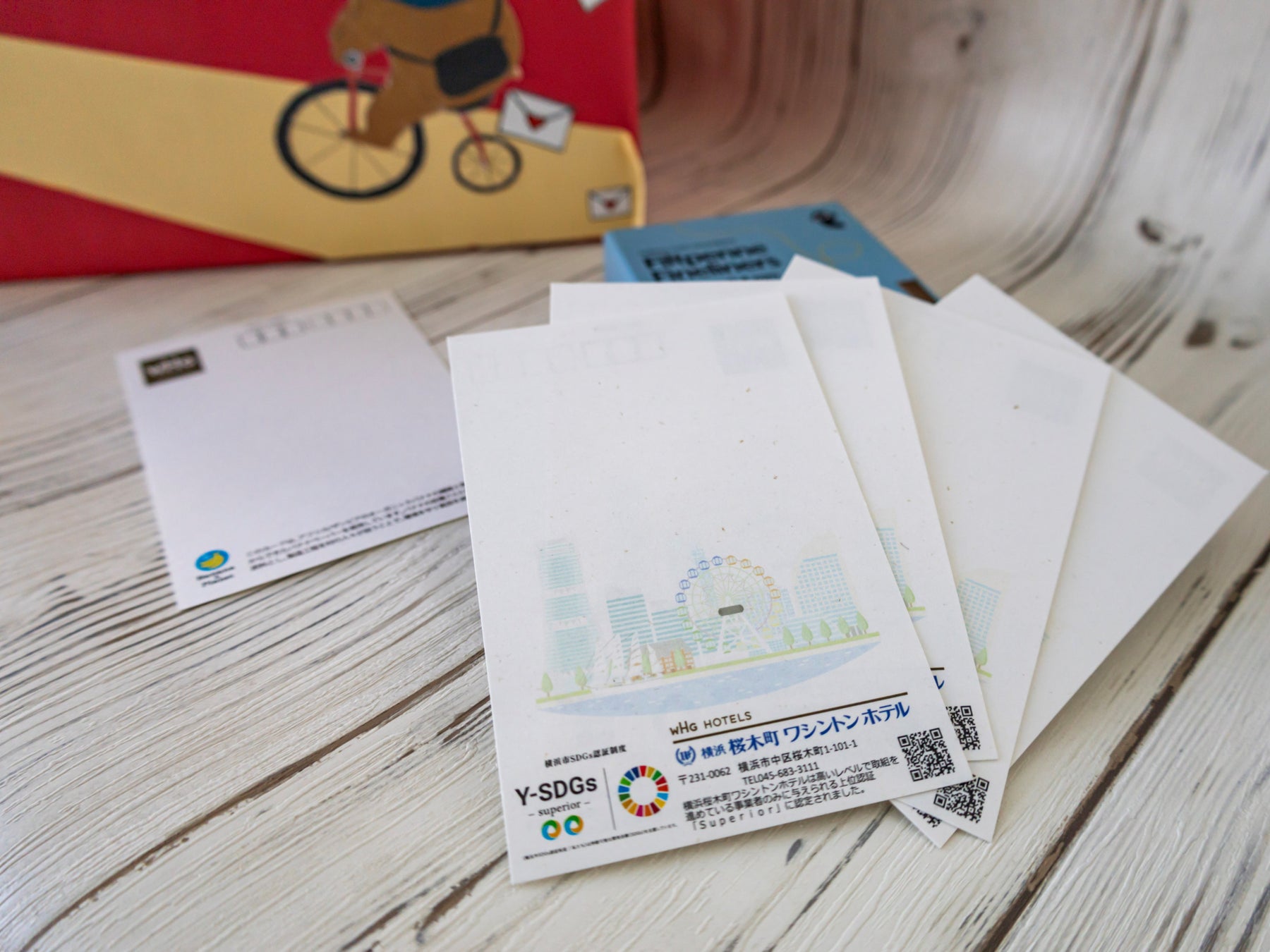 イベント期間中はホテルロビーに特設コーナーを設置し、お子様だけでなく大人の方もご自由にご参加いただけます。みなとみらいを感じられるオリジナルデザインのはがきとメッセージを書くためのペン類やFSC認証色鉛筆をご用意するほか、はがきの書き方やバナナペーパーの説明も展示いたしますので、はがきになじみのない方や外国からお越しの方にもSDGsをより意識しながら、楽しく体験していただけます。