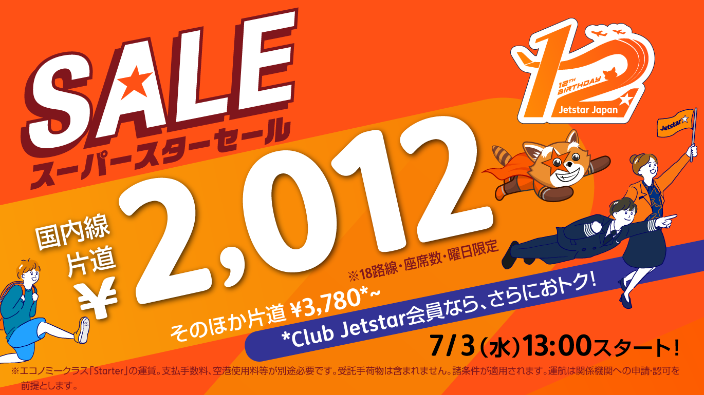 ジェットスター・ジャパン株式会社(本社:千葉県成田市、代表取締役社長:片岡優、以下:ジェットスター)は、2024年7月3日(水)に就航12周年を迎えるにあたり、複数の企画による就航12周年記念キャンペーンを実施します。
