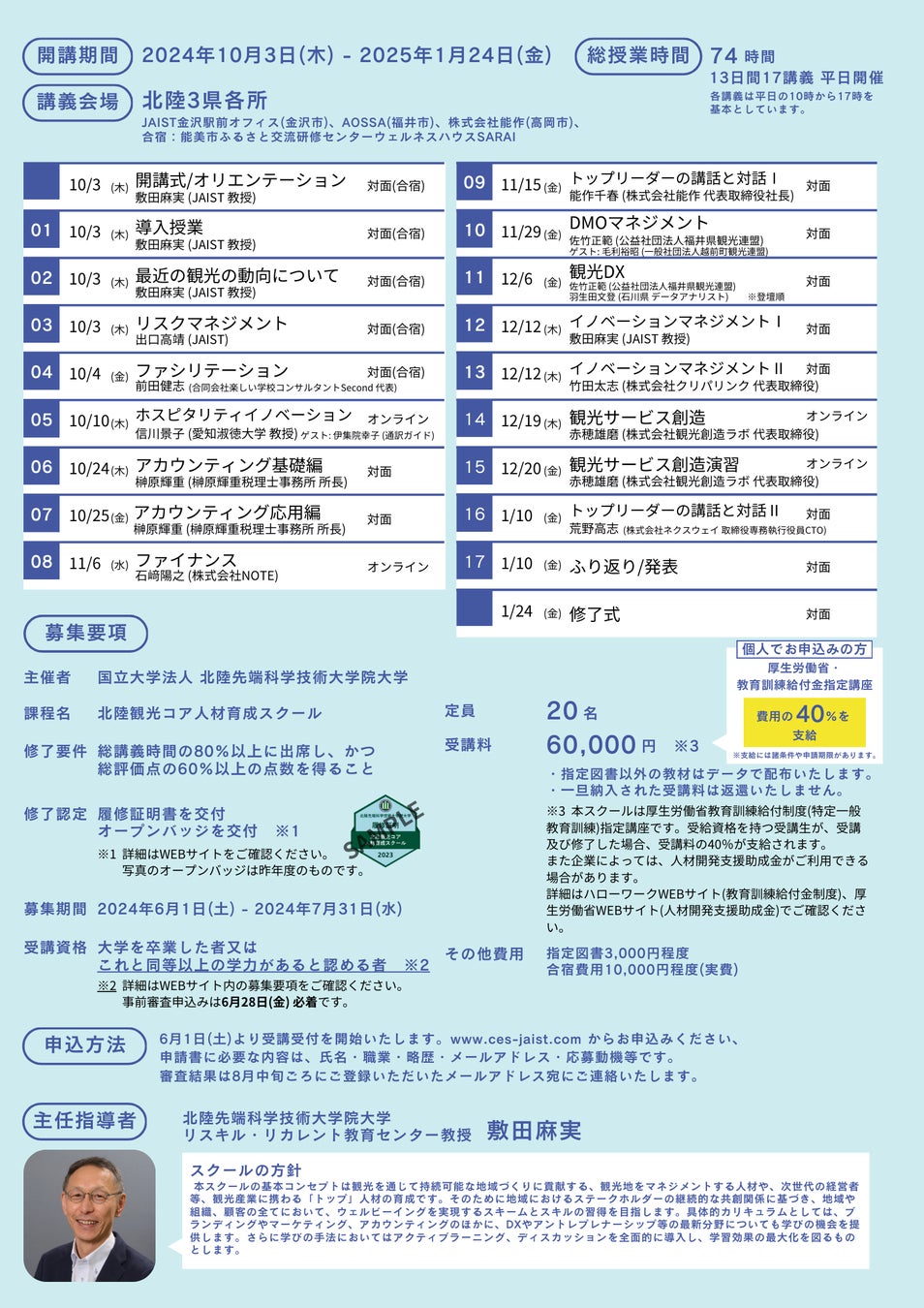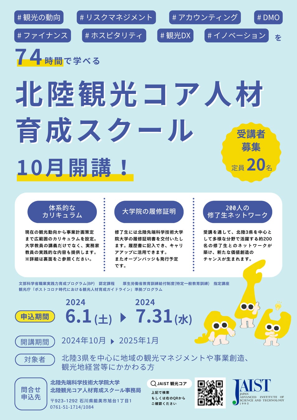 北陸先端科学技術大学院大学(JAIST/石川県能美市)では、現在「北陸観光コア人材育成スクール」受講生を募集中です。本スクールは地域の観光分野で新たな価値を創造できるリーダー育成を目指します。