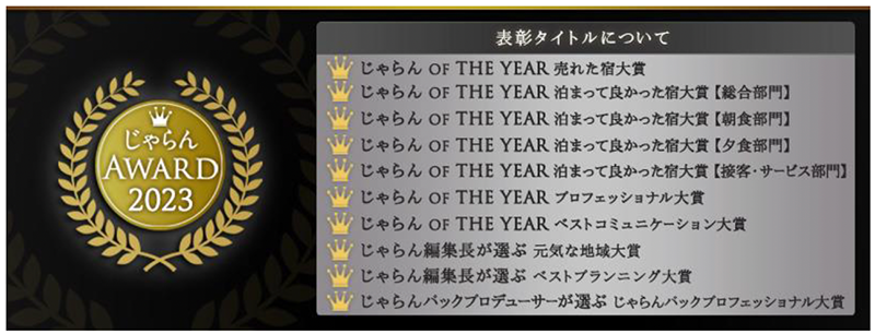 【審査基準】『じゃらん』編集長の審査により、新規性・独自性に特に優れたプランやプロモーション、取り組みをした宿泊施設に贈られます。