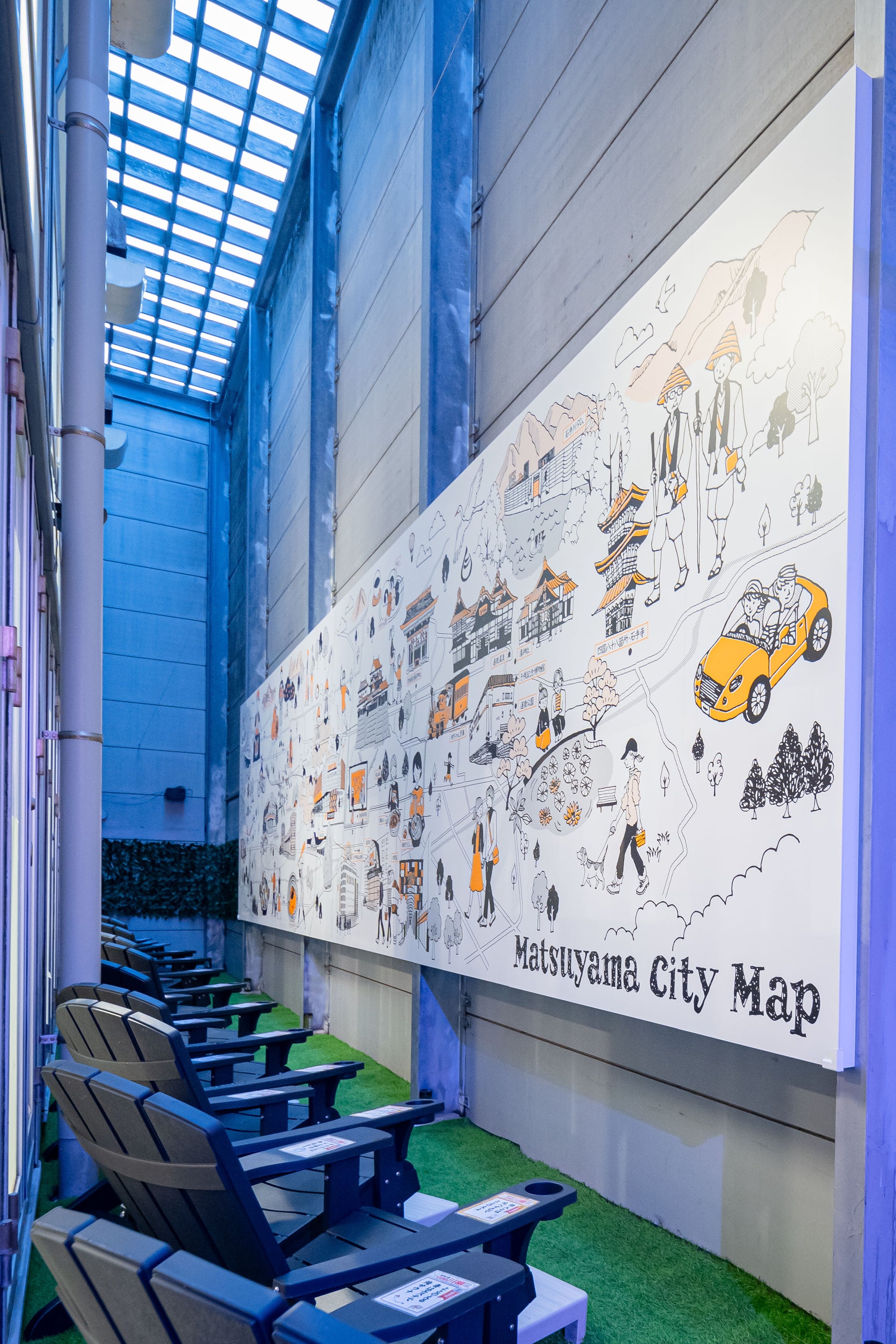 人気イラストレーターとコラボして制作した、伊予の湯治場 喜助の湯を中心とした松山市エリアマップを巨大壁画として展示しました。kScの活動の一環として、サウナ外気浴BGM「愛媛の音」を聴きながら、心ゆくまでととのってください。