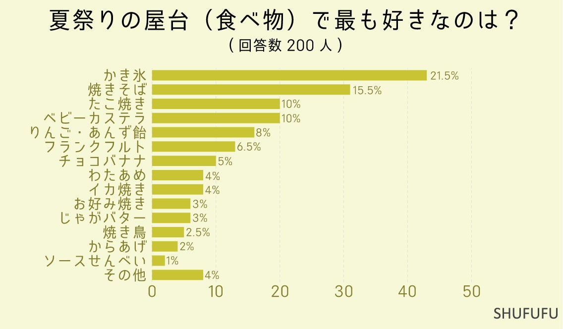 夏祭りの屋台(食べ物)で最も好きなものに関しては、「かき氷」が1位でした。暑い中で食べるひんやりとしたかき氷は最高ですよね。