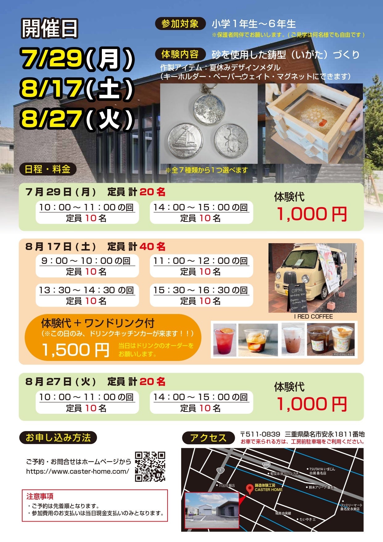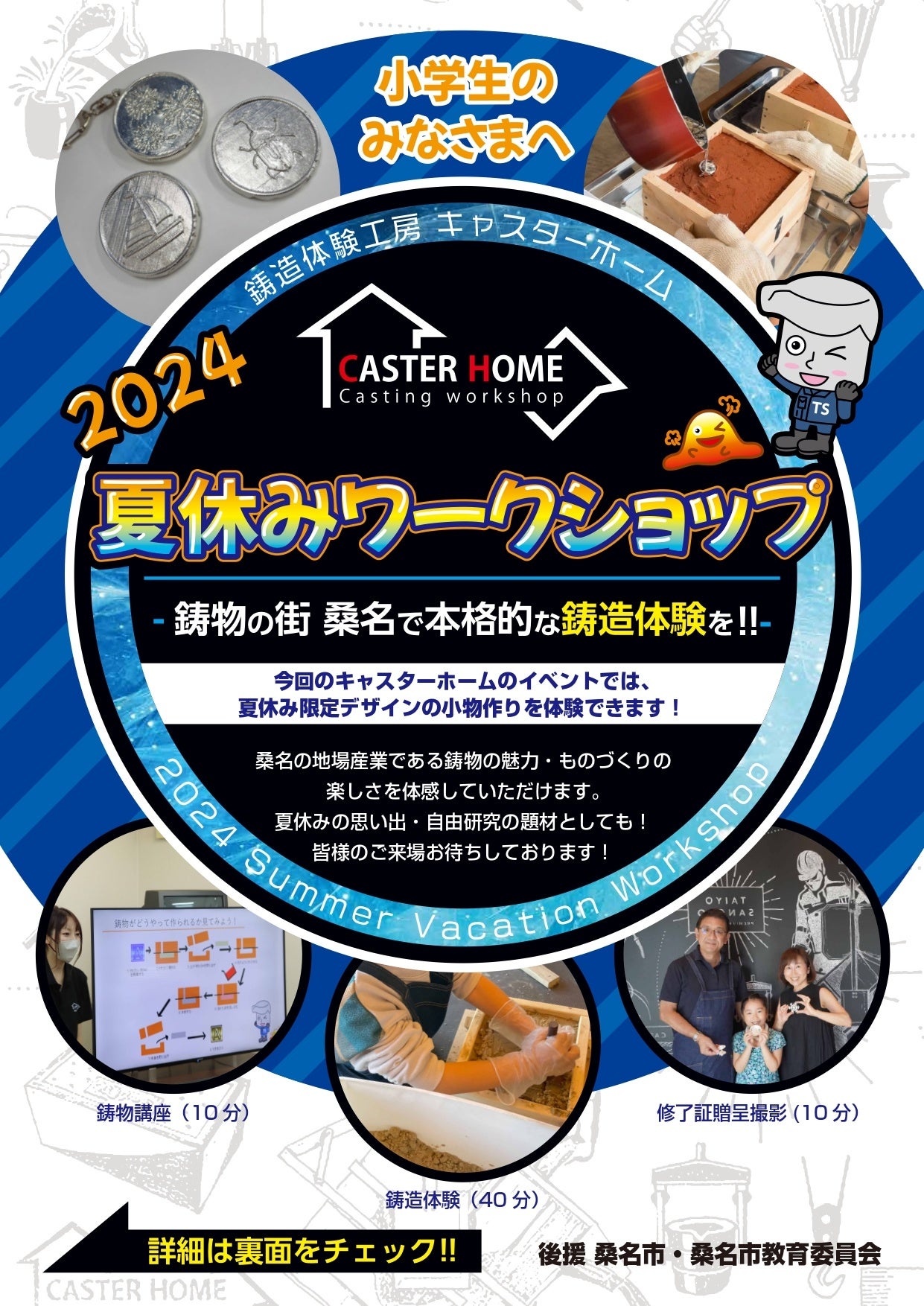 桑名市で鋳物を半世紀以上製造している大洋産業。鋳物づくりの魅力・楽しさを伝えるべく昨年オープンした鋳造体験工房キャスターホームにて、オープン後初となる夏休みワークショップを開催します!