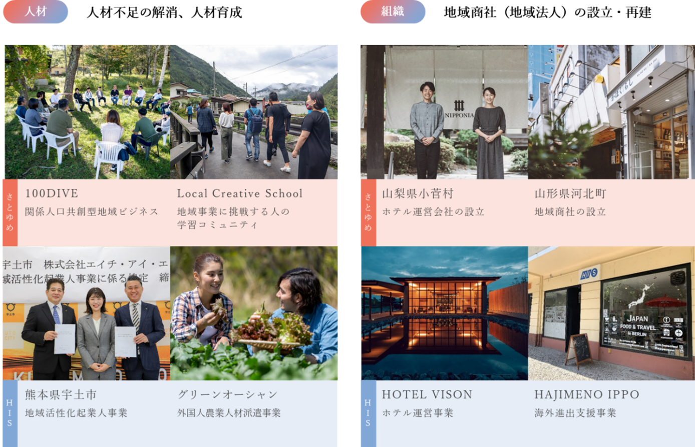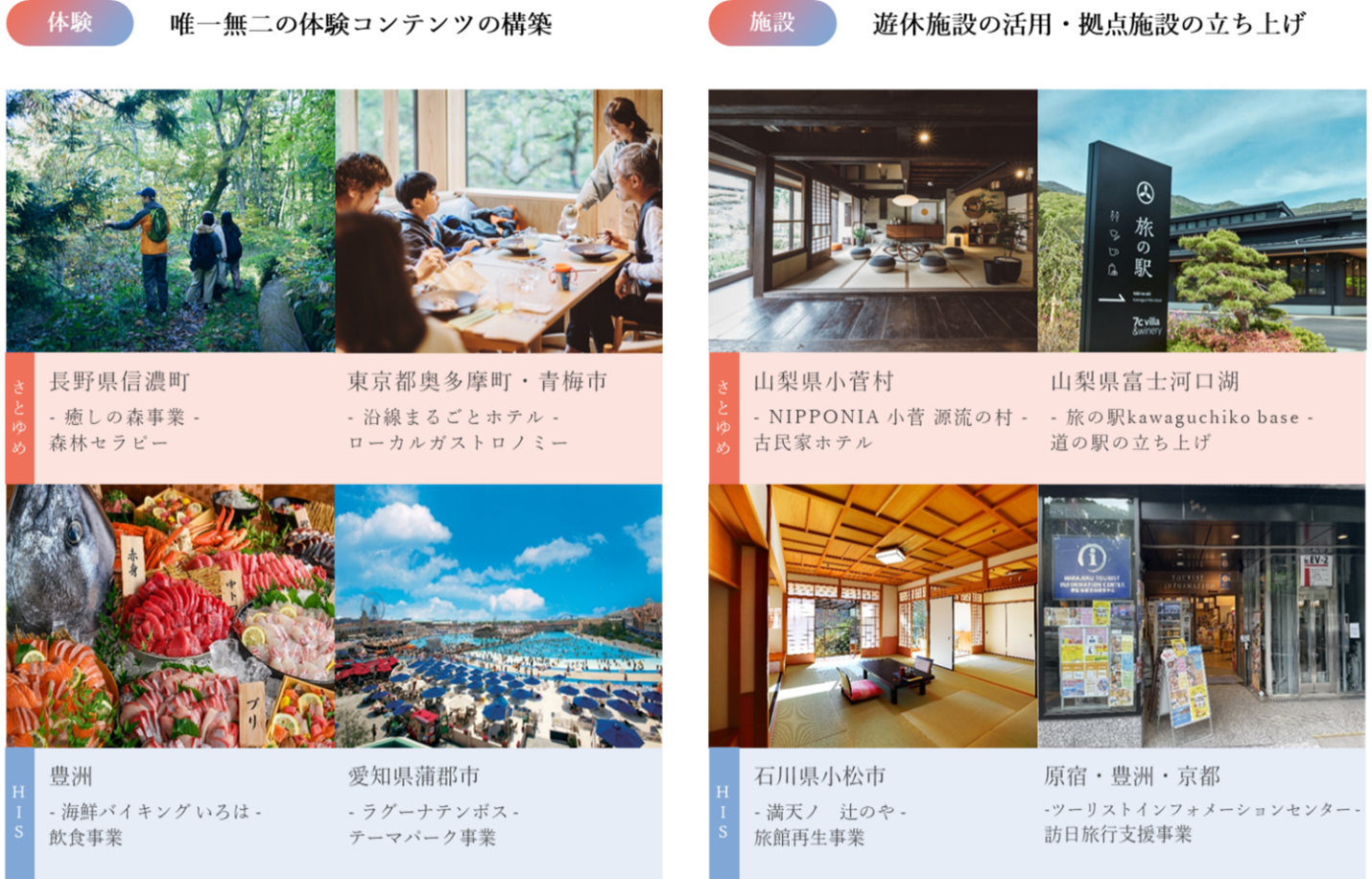 なお、さとゆめ・HIS両社は「新しい目的地」をつくる上で必要な「体験」(唯一無二の体験コンテンツの構築)、「施設」(遊休施設の活用・拠点施設の立ち上げ)、「人材」(人不足の解消、人材育成)、「組織」(地域商社の設立・再建)の領域で、確実なノウハウと実績を積み上げてきました。