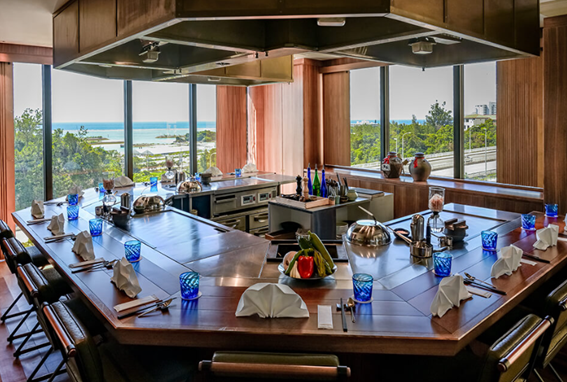沖縄県産⿊⽑和⽜と沖縄近海で獲れた新鮮な「活き」の海鮮、季節の島野菜を、一皿一皿お客様の前で食材の魅力を最大限に引き出した鉄板焼きのフルコースをご提供します。拘り選び抜いた⾷材はもちろん、シェフが⽬の前で「魅せる」ライブパフォーマンスと⾷事に花を添える楽しい会話にもご期待ください。美しい⼣陽もご覧いただける贅沢な空間で皆様をお待ちしております。