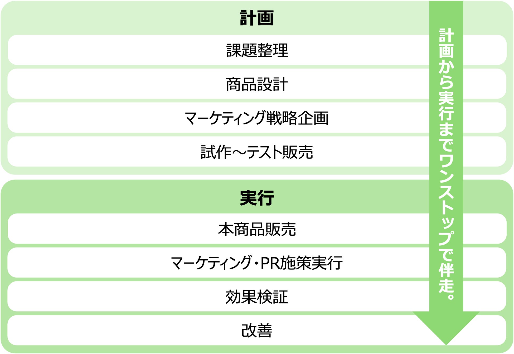 「どのような商品を作るべきか?」「ターゲットは誰か?」「どのような販売戦略を立てるべきか?」「プレスリリースはどのように打つか?」「ECなどはどうするか?」など、考えるべきこと、やるべきことが多々ある中、計画〜実行までトータルにサポートします。