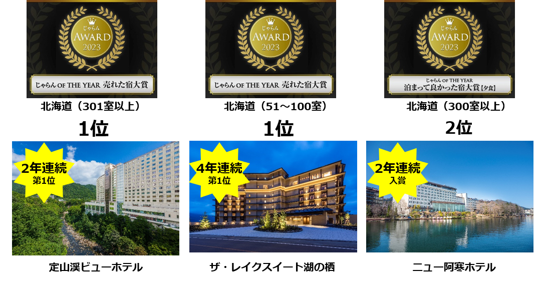 「定山渓ビューホテル」は、「じゃらんOF THE YEAR売れた宿大賞 北海道1位(301室以上)」を受賞し、2022年度に続いて2年連続1位を獲得。「ザ・レイクスイート湖の栖」は、「じゃらんOF THE YEAR売れた宿大賞 北海道1位(51~100室)」を受賞し、2019年度から4年連続1位を獲得しました(※)。さらに「ニュー阿寒ホテル」は、「じゃらん OF THE YEAR 泊まって良かった宿大賞 夕食部門 北海道2位(301室以上)」を受賞し、2022年度に続いて2年連続の入賞獲得となりました。※「じゃらんアワード2020」は未開催でございます。