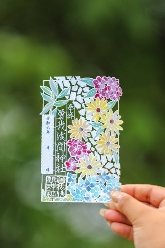 夏の花々をデザインした、曽我浅間神社御朱印がはじまります。神社に参拝後、初穂料2000円をお納めいただけますと御朱印と引き換えいたします。デザインは切り絵作家の大橋忍氏。夏限定かつ数量限定の御朱印となりますので、ぜひお立ち寄りください。