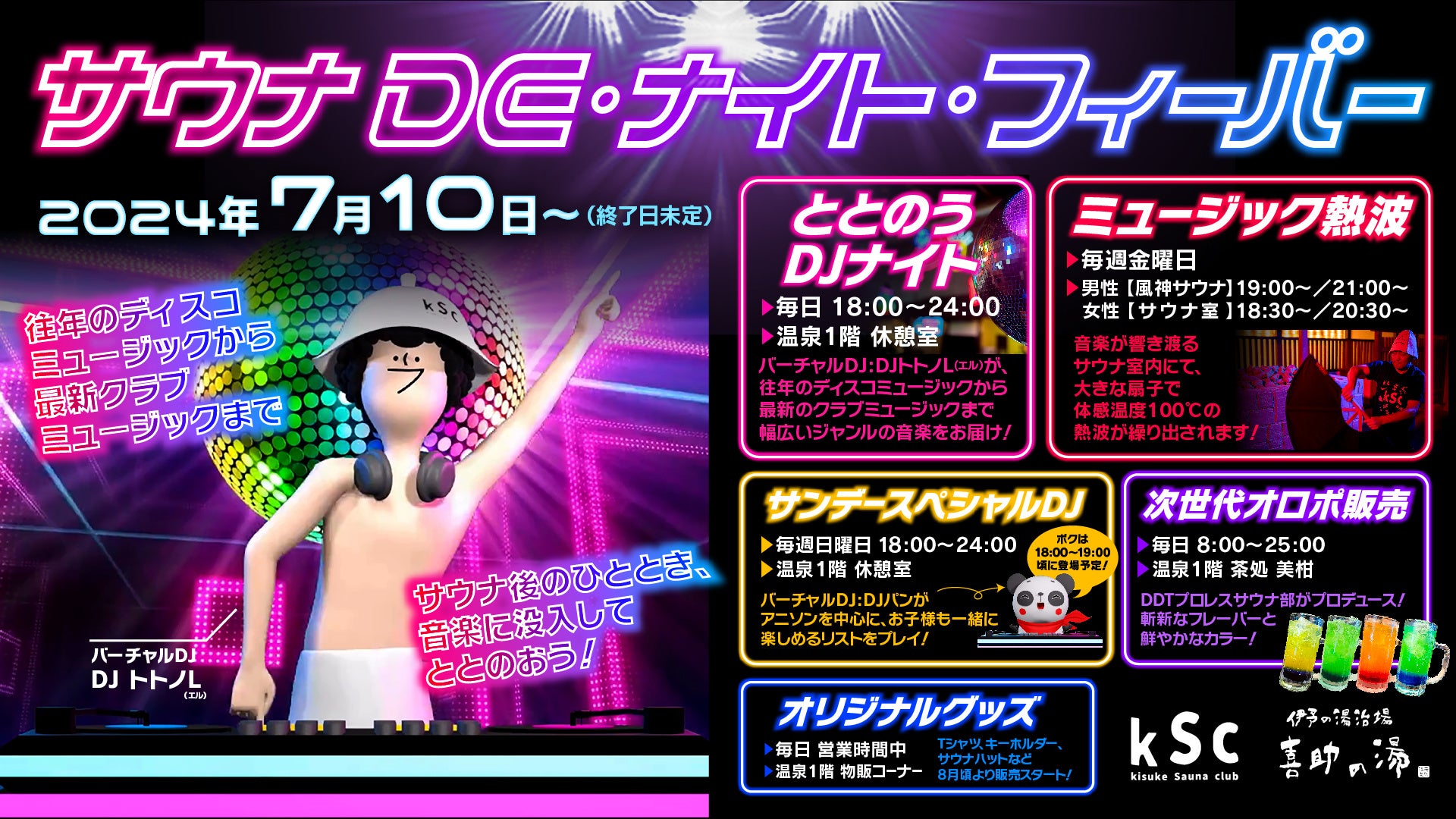 伊予の湯治場 喜助の湯(所在地: 愛媛県松山市)は、2024年7月10日より、新たなイベント「サウナDEナイト・フィーバー」を開催いたします。今回のイベントは、サウナ愛好家の皆様にさらなる癒しと楽しみを提供するためのもので、音楽とサウナの新しい融合をお楽しみいただけます。