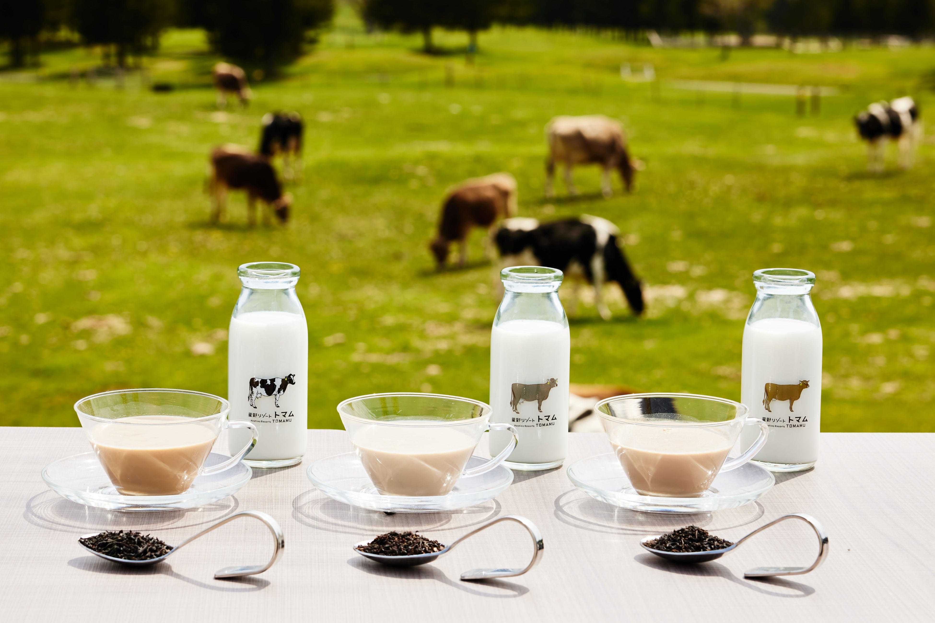 小菓子やフィンガーフードと共に楽しむのは、ファーム星野の品種別の牛乳に茶葉を合わせたミルクティーです。ファーム星野では、ホルスタイン、ジャージー、ブラウンスイスの3種類の牛が飼育され、品種ごとに牛乳の味わいが異なります。それぞれの牛乳の味に合わせて茶葉を選定し、品種別の味わいを楽しむことができます。例えば、ホルスタインから採れた牛乳と合わせる茶葉はウバです。日本の牛乳の99%がホルスタインから生産されていて、他の牛乳に比べてすっきりとした飲み口です。これに爽やかで芳醇な味わいのウバを合わせることで、紅茶の香りはそのまま、すっきりとした味わいを楽しめます。