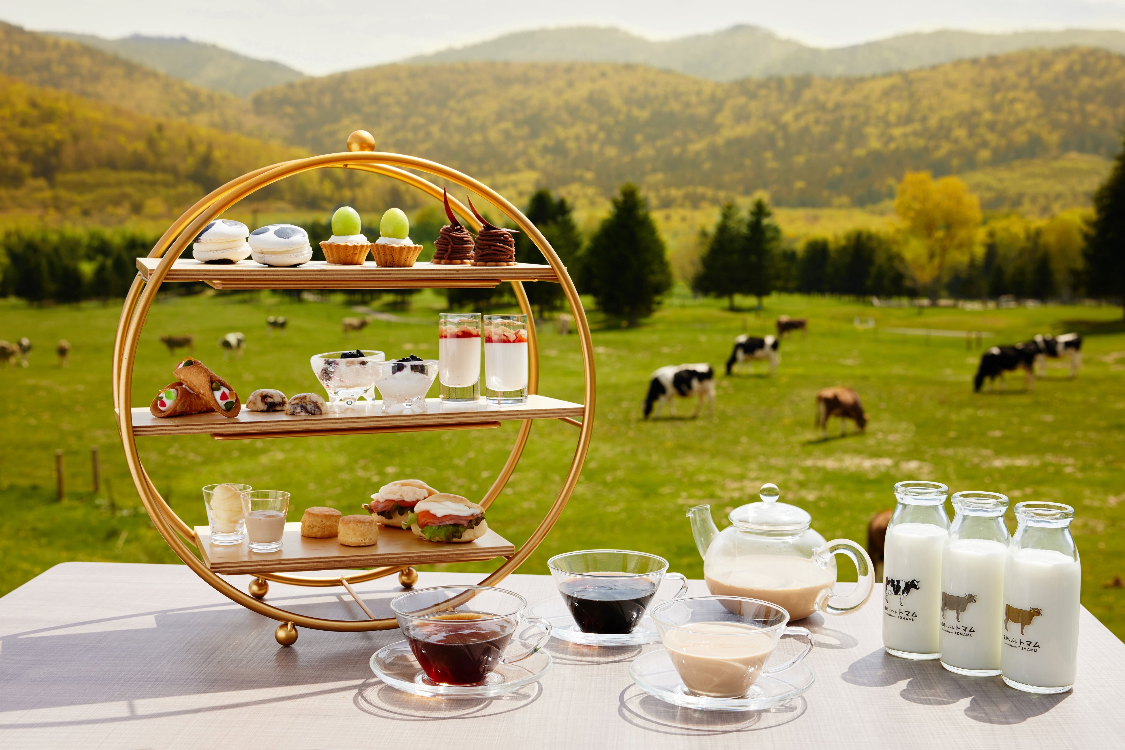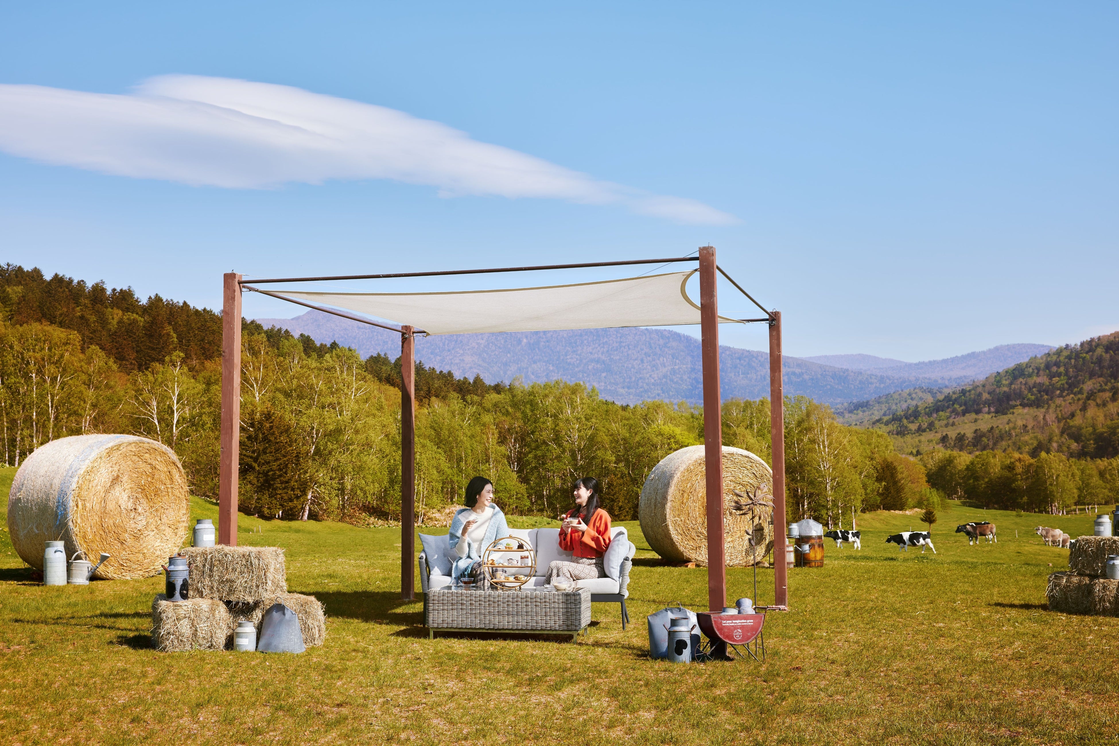 ファームアフタヌーンティーは、北海道ならではの風景が広がる ファームエリアで楽しめます。ファームエリアは、牛やヤギ、羊などの動物がのんびりと暮らす約100 ヘクタールの広大な景色を望める場所です。ファームエリアの一角にソファが設置されているので、秋の白樺の葉が黄色く染まる様子など、大自然の風景を眺めてゆったりと寛ぎながら、秋のひとときを過ごせます。今年の会場は2席のみのご用意。牧草の装飾もあり、よりファームらしさを感じながらアフタヌーンティーが楽しめます。