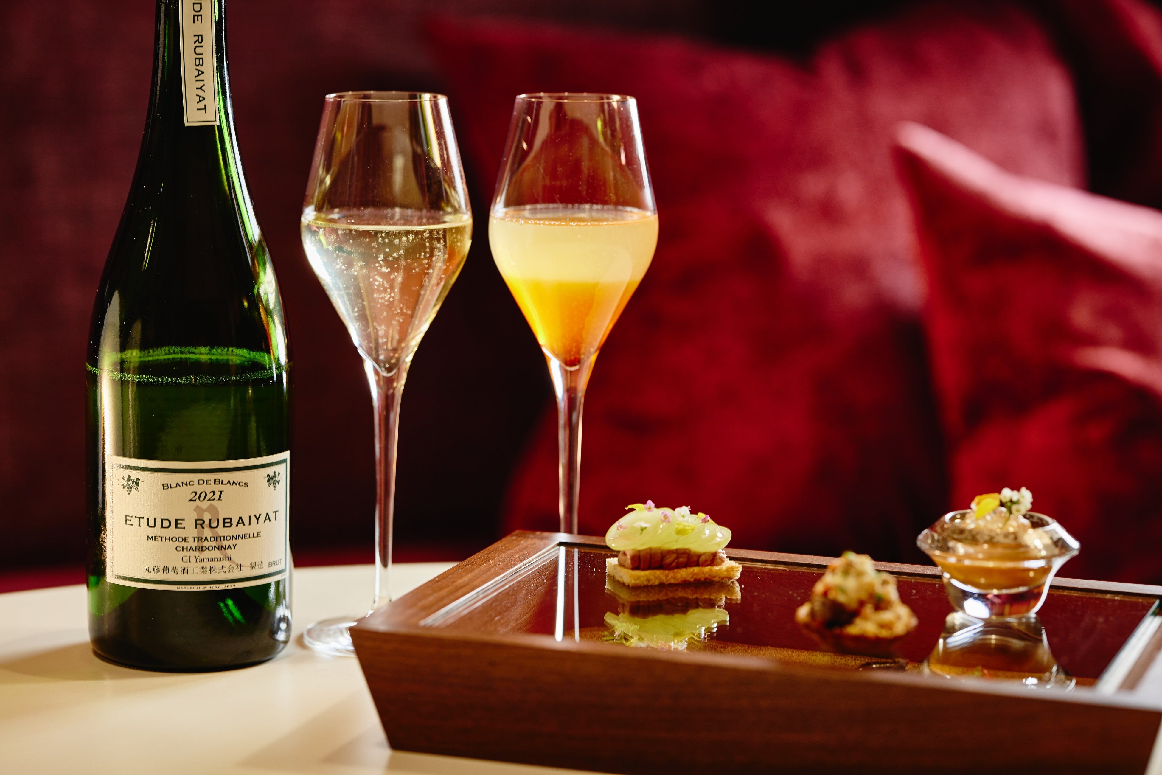 到着後、客室「ワインスイートメゾネット」でウェルカムワインを提供します。提供するのは「日本ワイナリーアワード2023」で五つ星を獲得した丸藤葡萄酒工業株式会社(山梨県甲州市)の「エチュードルバイヤート2021」です。2杯目には同じワインと梨のピューレを合わせた秋らしいカクテルを提供します。同じワインの味わいの変化を楽しめます。