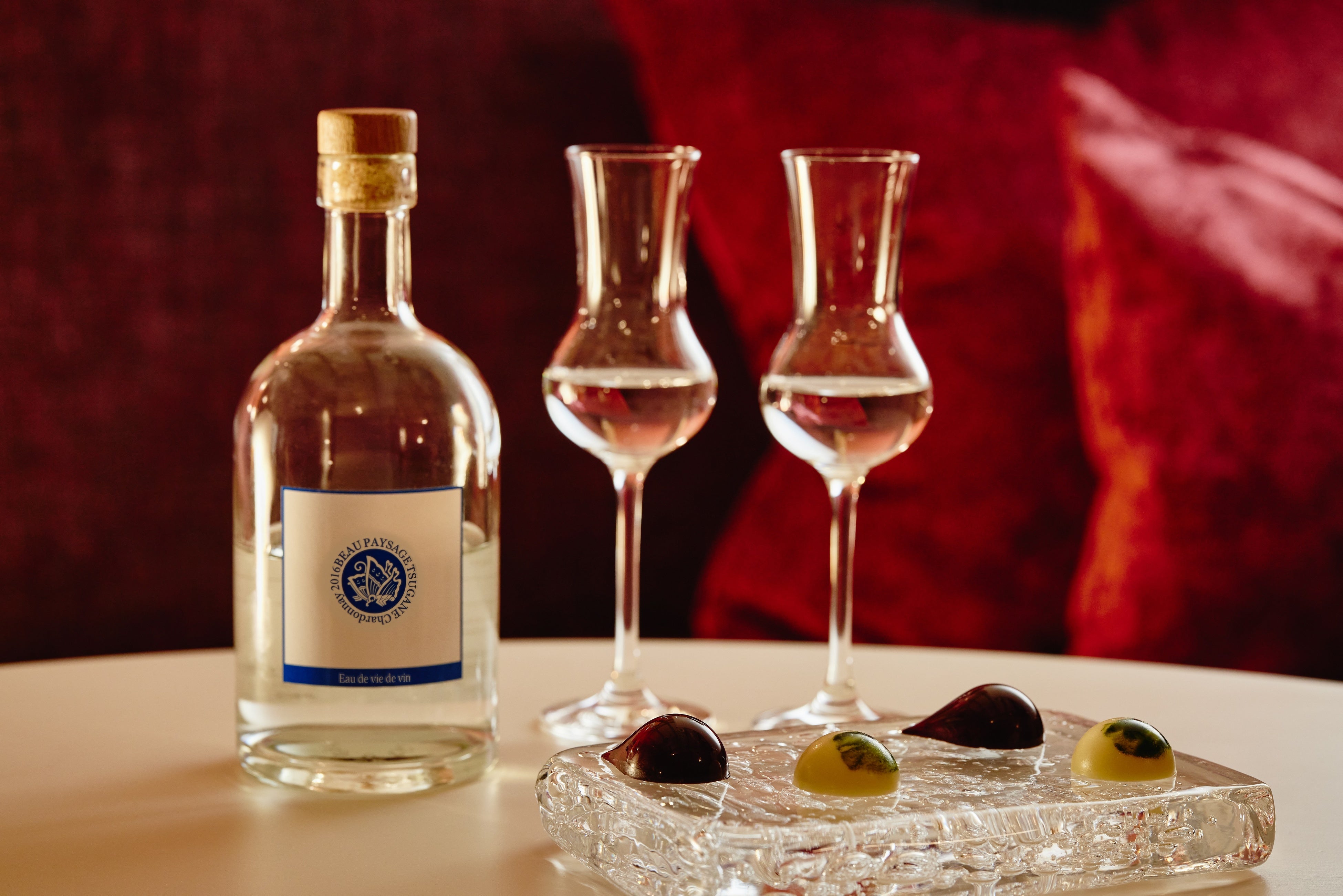 食後は客室「ワインスイートメゾネット」で食後の余韻を楽しむディジェスティフを提供します。ディジェスティフには、シャルドネを使ったブランデー「オー・ド・ヴィー・ド・ヴァン ボーペイサージュ シャルドネ2016」(BEAU PAYSAGE/山梨県北杜市)を用意。洋梨や白い花を想起させるフローラルなニュアンスとほのかなスパイス、透明感のある味わいが魅力です。シェフ特製のボンボンショコラと共に食後の余韻に浸る贅沢なひとときを過ごせます。