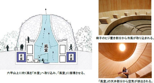 毎年、六甲枝垂れの開業日である7月13日になると、氷を貯蔵した「氷室」の扉を開放し、六甲山上に吹く風を取り込む「氷室開き」を行います。氷室を通った風は冷気となり、展望台内部の「風室(ふうしつ)」にある椅子のヒジ置き部分から風室内へ取り込まれます。風室内は神戸市街地と比べて約10度気温が低く、ヒノキの香りと共にひんやりと心地良い空間が広がります。この電力を一切使用せずに、自然の力だけで涼が楽しめる体験が「冷風体験」です。