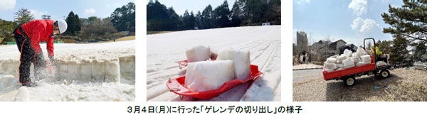 例年、1月20日頃の「大寒の日」に六甲枝垂れの「氷棚(ひょうだな)」にできた氷を切り出しておりましたが、今年は暖冬の影響で結氷不良が続いた為、近隣にある六甲山スノーパークのゲレンデの人工雪をシーズン終了後の3月4日(月)に切り出して、展望台内部にある「氷室(ひむろ)」に貯蔵しました。5月29日(水)に確認したところ、貯蔵した人工雪が7割程残っていた為、人工雪が溶けて無くなるまで冷風体験を実施いたします。役目を終えたゲレンデを再活用したこのエコな取り組みによって、今年の夏も皆様に「涼」をお届けしたいと思います。