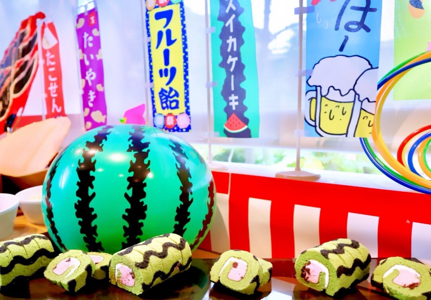 たい焼きや、食べてるだけで夏を感じるキュートなスイカケーキ、お子様も大人気分を楽しめる”こどもビール”(りんごジュース)、そして、金魚すくいならぬカラフルに散りばめられた“ゼリーすくい”をご用意しております。