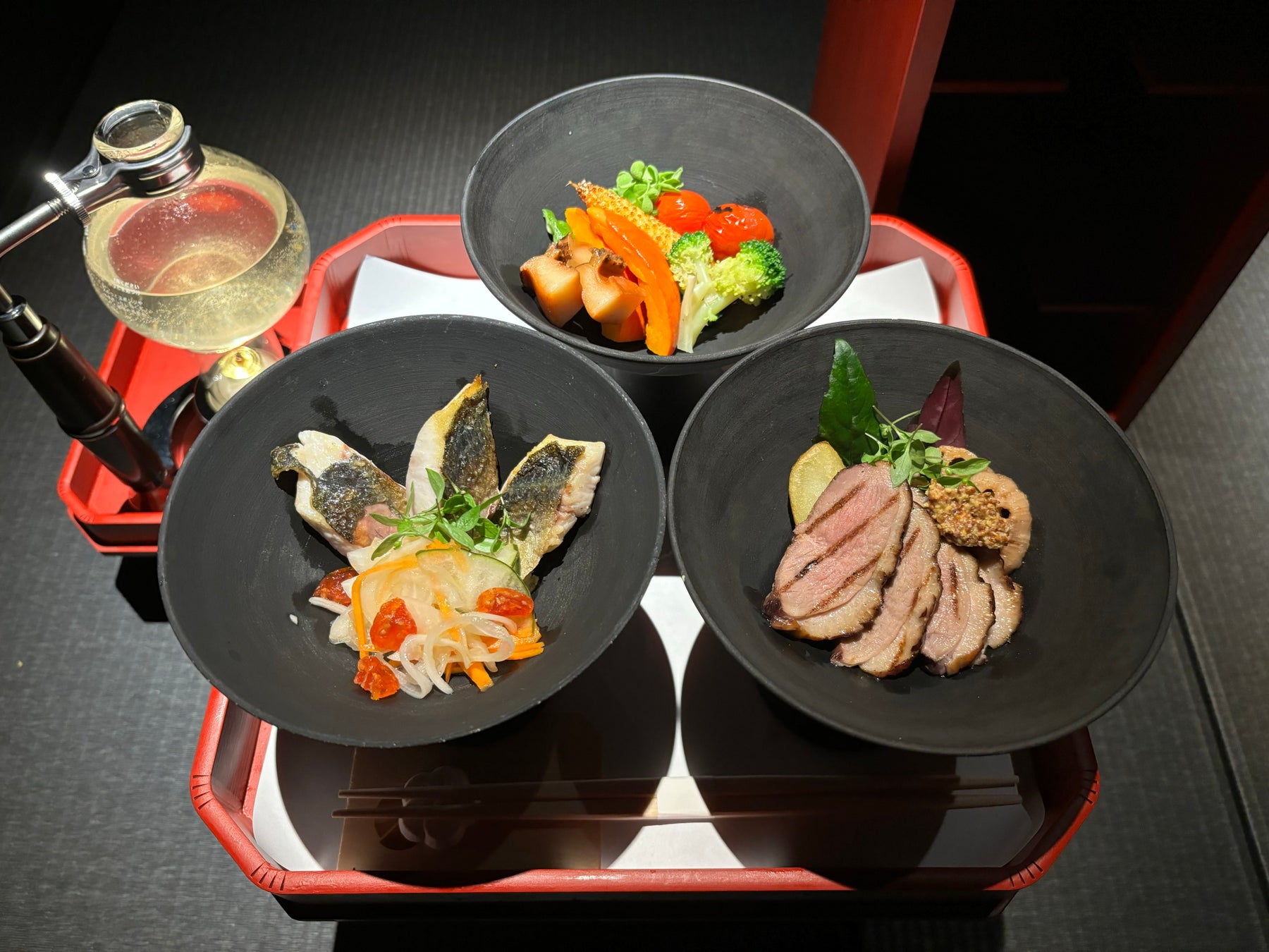 「barrier=結界」をコンセプトに、賑わいのある金沢市街の中心にありながら、喧騒とは線をひき、界を結して、古えと現代、陰と陽の対比を感じていただく神聖な空間をつくる結界をイメージしました。古民家を繊細にリノベーションした空間は、アートと料理が絶妙に結びつき、お客様が時間や空間を超えた旅に出るかのような体験を提供します。料理は三方(さんぼう)をお膳として利用し、岡持ち(おかもち)に収められた三つのお椀料理に、サイフォンで抽出された一番出汁を注ぎます。伝統と革新が見事に調和した漆黒の空間で五感を研ぎ澄ませて、出汁の新しい世界を体験してください。