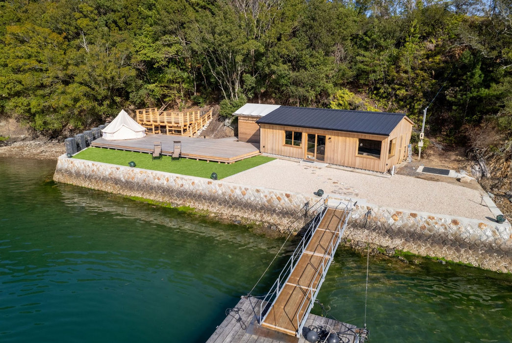 「UMILABO」は廃業した真珠養殖場を、企業研修や宿泊が可能な複合施設として再生しました。施設が位置する三重県志摩市の英虞湾(あごわん)では、明治以降から真珠養殖が盛んに行われていました。全盛期には約1,300もの真珠養殖場がありましたが、その後さまざまな課題があり、現在湾内には約300箇所以上の養殖場が空き家として取り残されています。国立公園の中に位置し、複雑な地形をしている湾内の空き養殖場の再生にはアクセスの点で困難ではあるものの、国立公園内で大自然を船で移動しながら楽しめるという非日常感を味合うことが可能です。