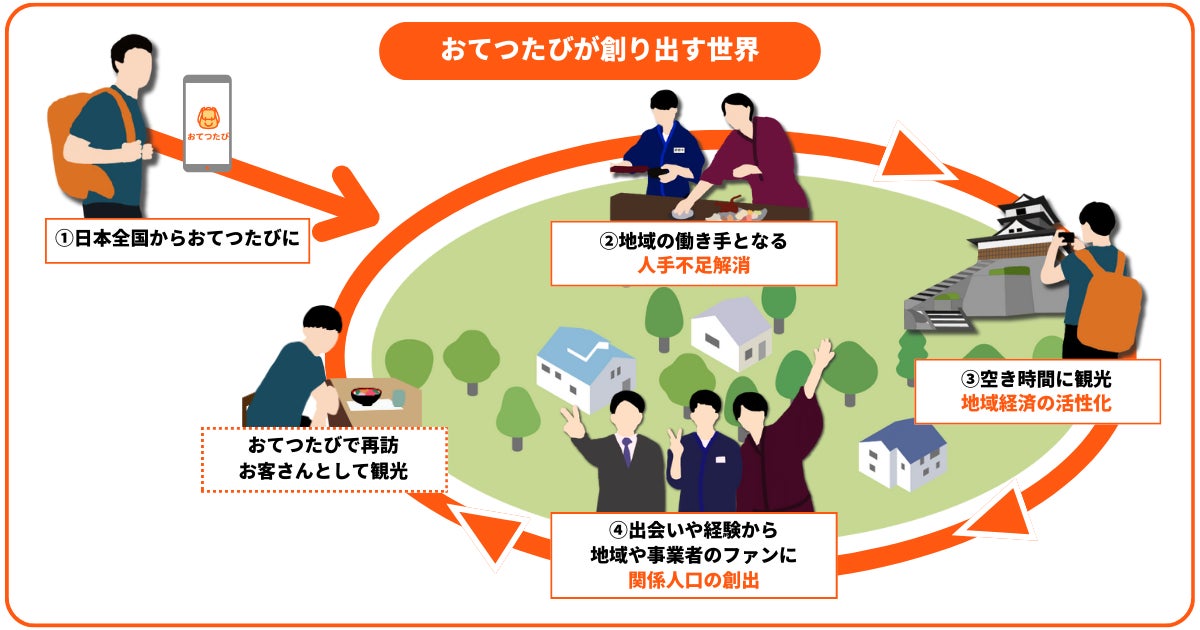 「お手伝い」と「旅」を掛け合わせた造語で、短期的・季節的な人手不足で困っている地域事業者(農家や旅館など)と、「働きながら旅を楽しみたい人」をつなぐ人材マッチングサービスです。