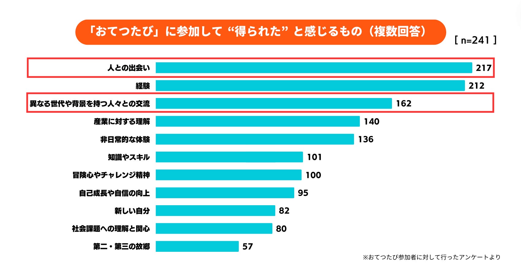 一人で参加しても、受け入れ先の「地域の方」や、募集によっては同じ日程で参加している「おてつたび仲間」との交流があるため、完全に一人ではありません。実際に、おてつたび参加後のアンケートでは、「おてつたびに参加して得られたと感じるものは?」という質問に対して、『人との出会い』が最も多く挙げられました。また、『異なる世代や背景を持つ人々との交流』は3番目に多い回答となりました。