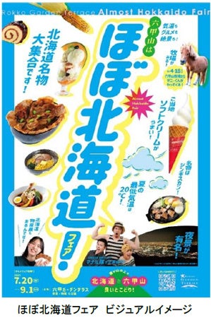 エリア内の飲食・物販5店舗では、7月20日(土)~9月1日(日)にグルメイベント「ほぼ北海道フェア」を初開催します。六甲山は夏の冷涼な気候やジンギスカンを始めとする名産品、美しい夜景など、北海道との共通点が多く、まるで北海道にいるような気分を味わえます。飲食3店舗では北海道産の食材を使った豚丼などのグルメ提供、物販2店舗では北海道から厳選して集めた特産品の販売を行います。加えて、思わず納得してしまう六甲山と北海道のあるあるネタを紹介する「ほぼ北海道パネル展」や、六甲山牧場からミニチュアホースのサニーくんがやってくるイベントも実施いたします。
