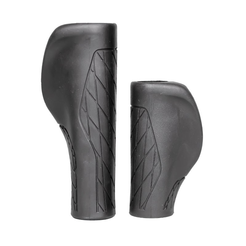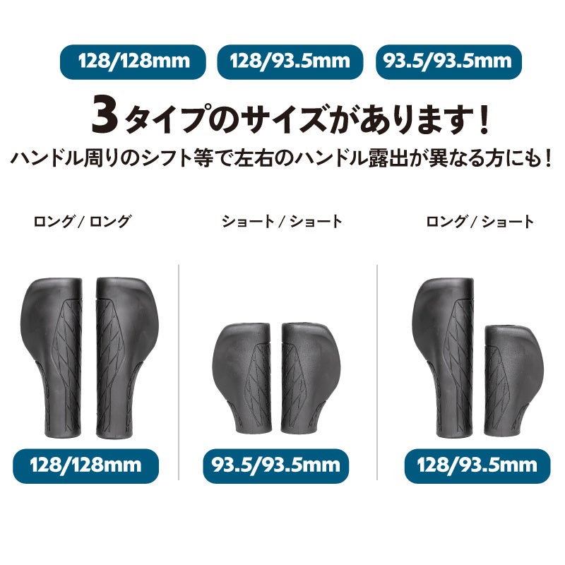 高いグリップ力と人間工学に基づくエルゴノミック形状で、短めの自転車ショートグリップをお探しの方にもおすすめです。ロングサイズとショートサイズの左右違いの組み合わせもあります。