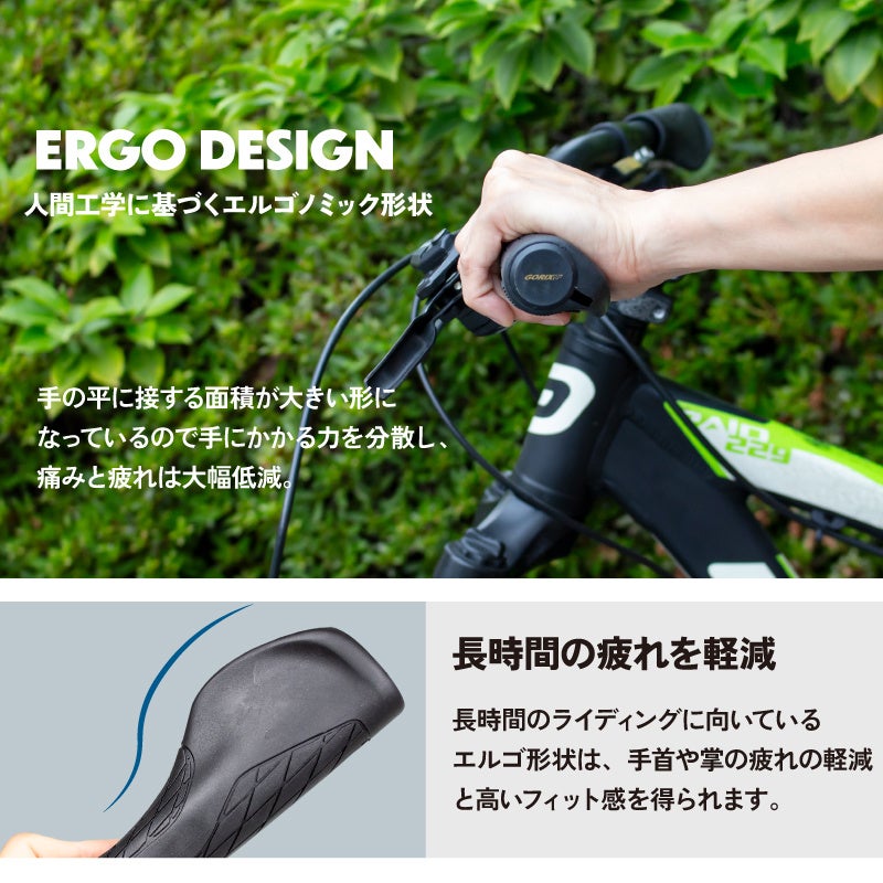 長時間のライディングに向いているエルゴ形状は、手首や掌の疲れの軽減と高いフィット感が期待できます。