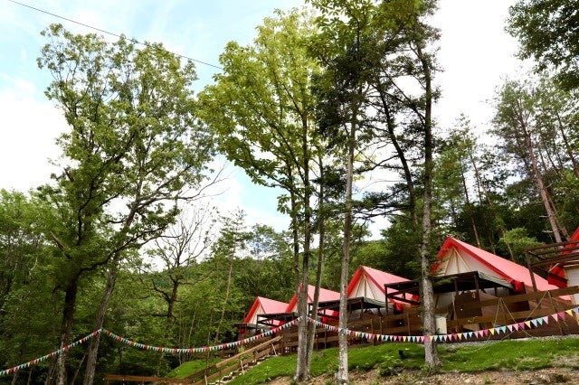 木々の緑に赤いテントの屋根が映えるウッドデザインパーク与位は、兵庫県第2の面積を誇り、さらにその面積の80%が森林という「森林王国」である宍粟市に位置します。