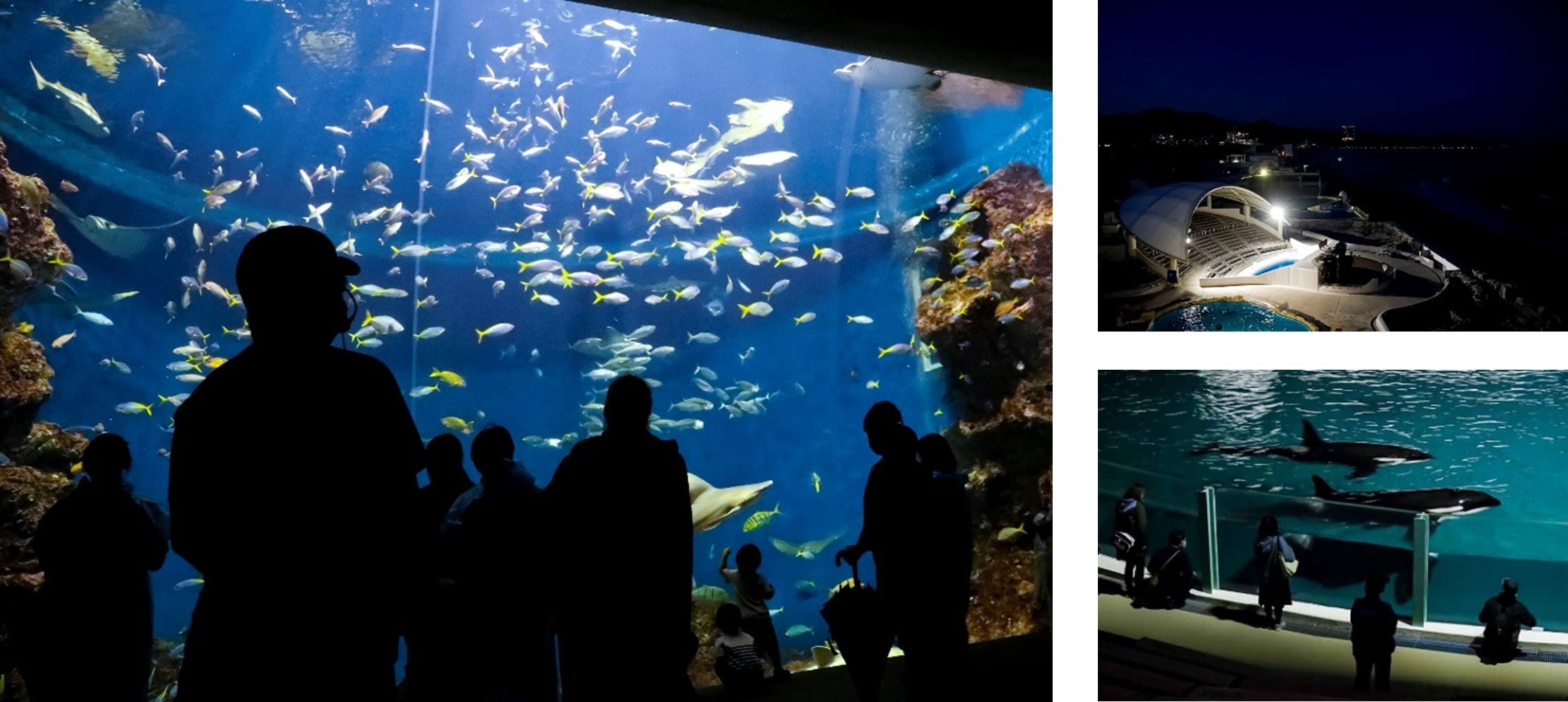 「ナイトアドベンチャー」は、飼育員の案内で閉館後の水族館を約1時間かけて巡り、動物たちの寝姿を観察するガイドツアーです。日中にパフォーマンスで活躍するシャチやアシカたちは、どのように夜を過ごしているのでしょうか?大人も子どもも「ワクワク」してしまう夜の水族館で、動物たちの夜の姿や眠りかたを飼育員が解説します。この夏は「トロピカルアイランド」が観察コースに入っており、南国の雰囲気が漂う夜の入江や神秘的な大水槽の様子もご覧いただけます。