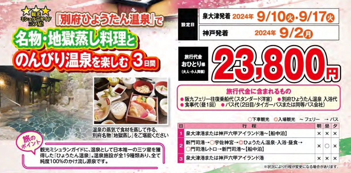 阪九フェリー・泉大津港発または神戸六甲アイランド港発(北九州・新門司港行き)で大分県の別府ひょうたん温泉へ行く団体バスツアーを販売しております。