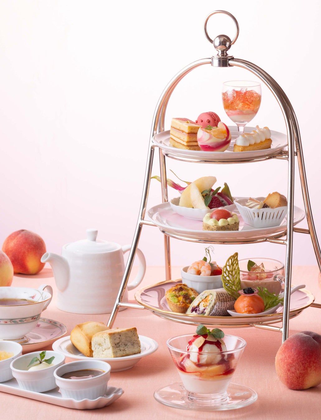 1・2段目には、杏仁豆腐入りの涼し気なグラスデザート「ピーチとスパークリングワインのヴェリーヌ」をはじめ、桃と滑らかなレアチーズをチョコレートカップに入れた可愛らしい「ピーチのクレームダンジュ」や、桃の「オペラ」「エクレア」などが並びます。別添えのひんやりスイーツ「ピーチメルバ」もご用意!